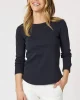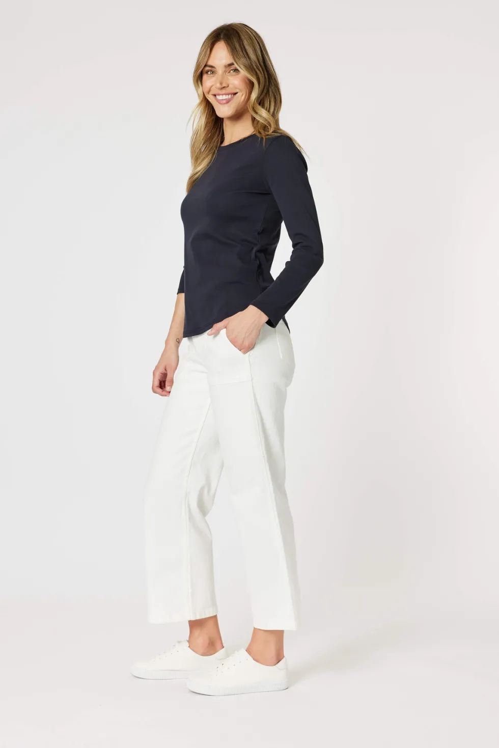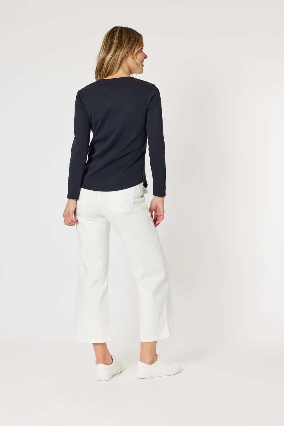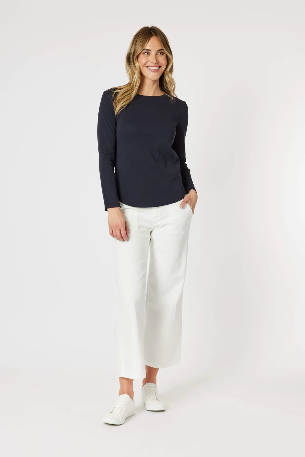 #40176 Crew Neck Long Sleeve Top – Navy by Gordon Smith at The Wardrobe. Everyone needs that basic but essential Long Sleeve Tee to layer with and our Best-selling Classic Crew Neck Cotton Top is just that! Crafted in a lightweight stretch ribbed fabric that is designed to move with you and keep you comfortable all d