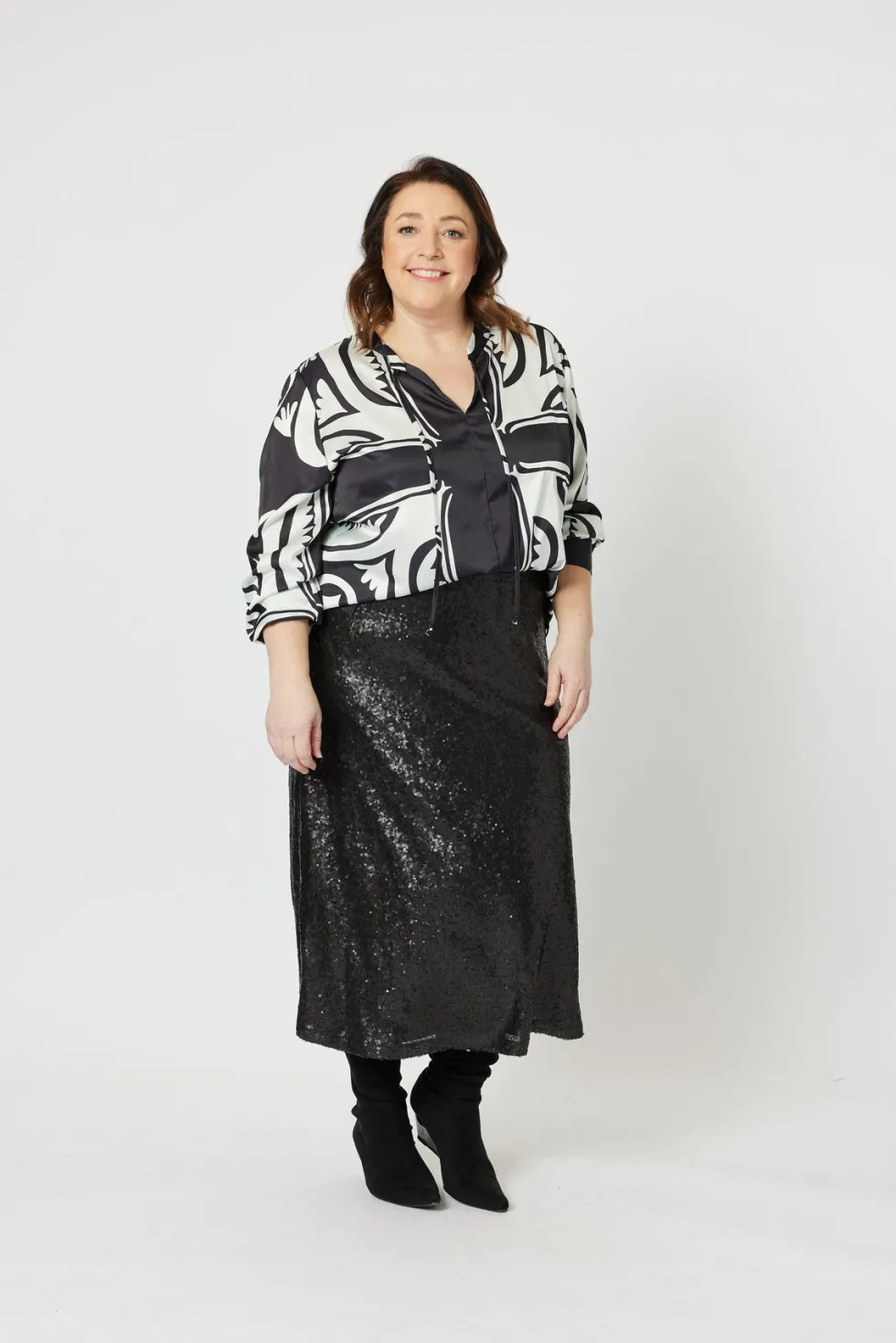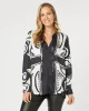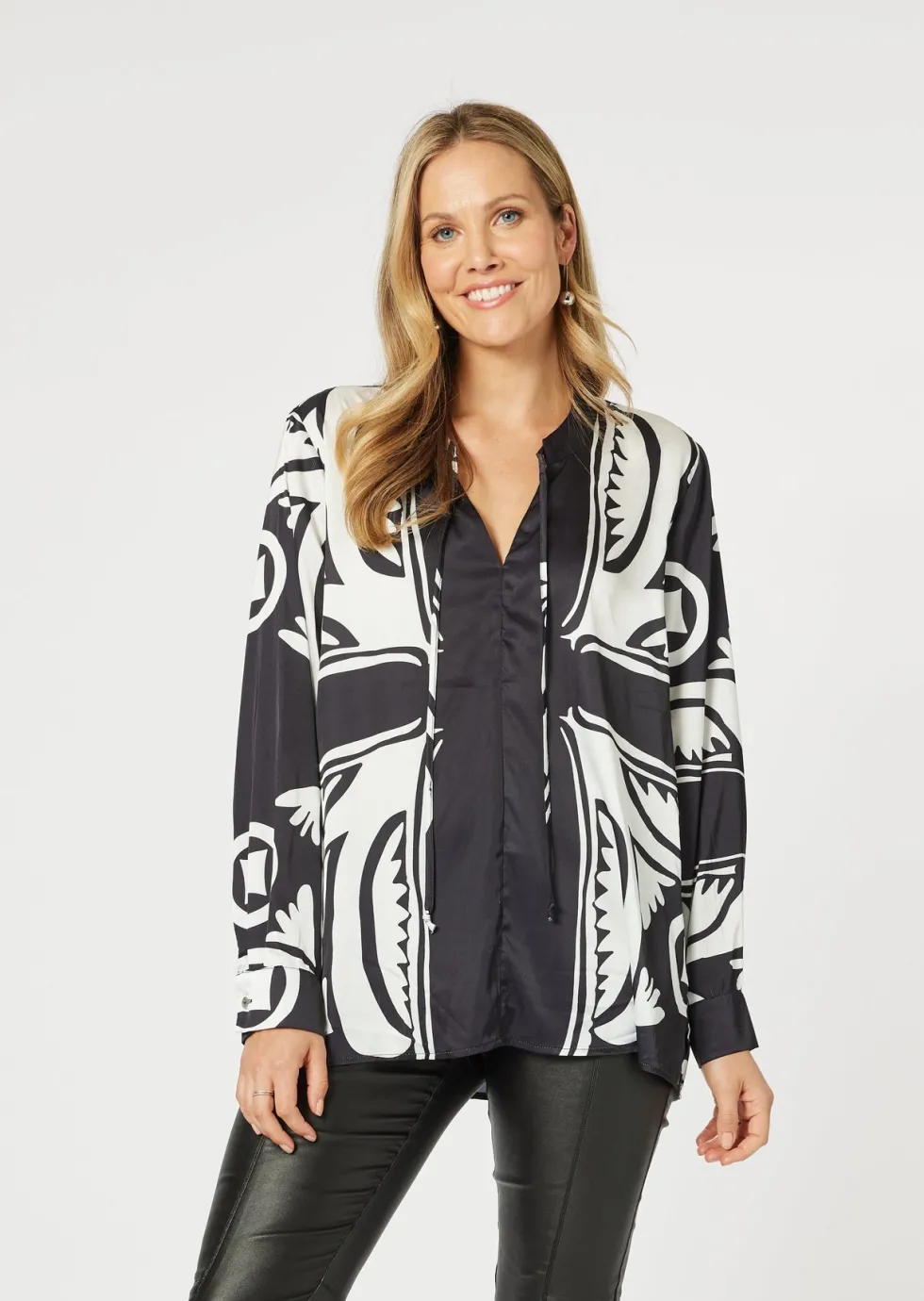 44805 – Chic Print Top – Black by Hammock and Vine at The WardrobeFeatures: 100%Polyester Soft fluid satin finish All over print Pop over the head style Flat nehru collar V neckline with self ties Cuff & button opening on sleeve Fit Guide: Relaxed fit Collared Long sleeve