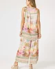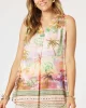 Passport Cami 48187 – Sunset Multi by Hammock & Vine at The Wardrobe Features: Bring vacation vibes to your everyday wardrobe with the Passport Print Cami. Featuring an eye-catching tropical print in sunset-inspired hues, this sleeveless top showcases playful passport stamp graphics, palm trees, and coastal motifs.