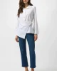 City Line Stretch Poplin Fitted Top 253132 by Joseph Ribkoff at The Wardrobe. This classic top is designed to suit every occasion and every style. Impeccably tailored in a stretch poplin fabric, this piece features a chic shirt collar and cuffed long sleeves to create a polished look. The overlap with tie detail on the