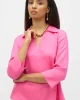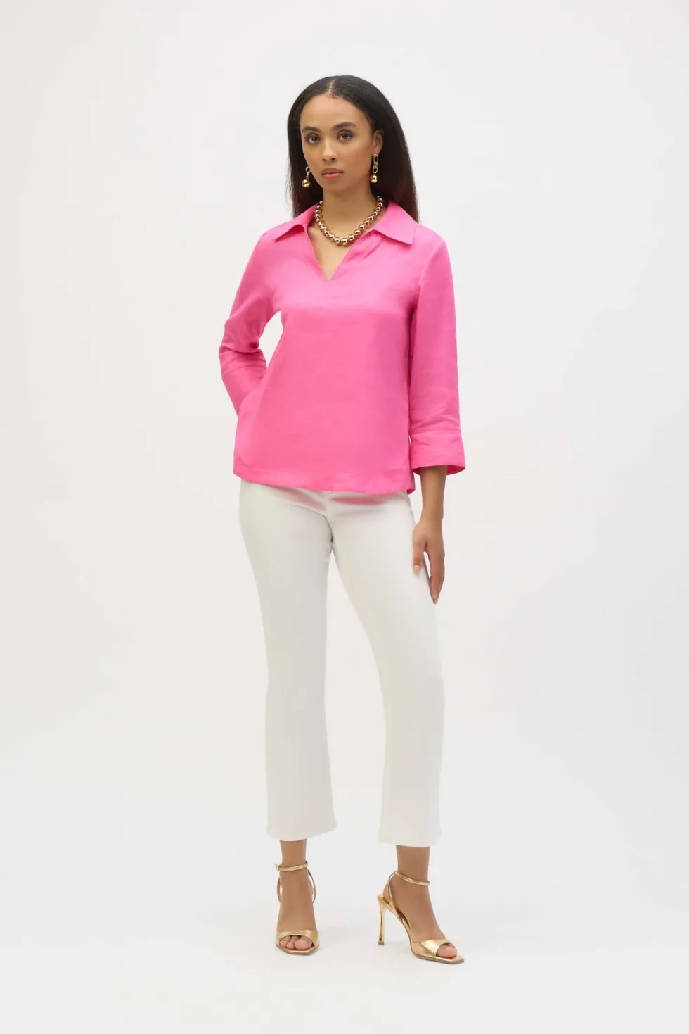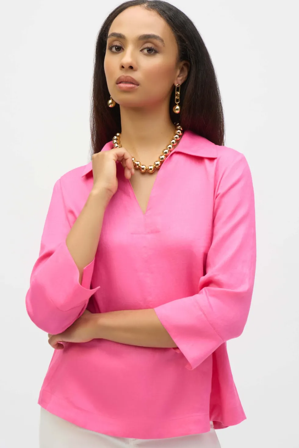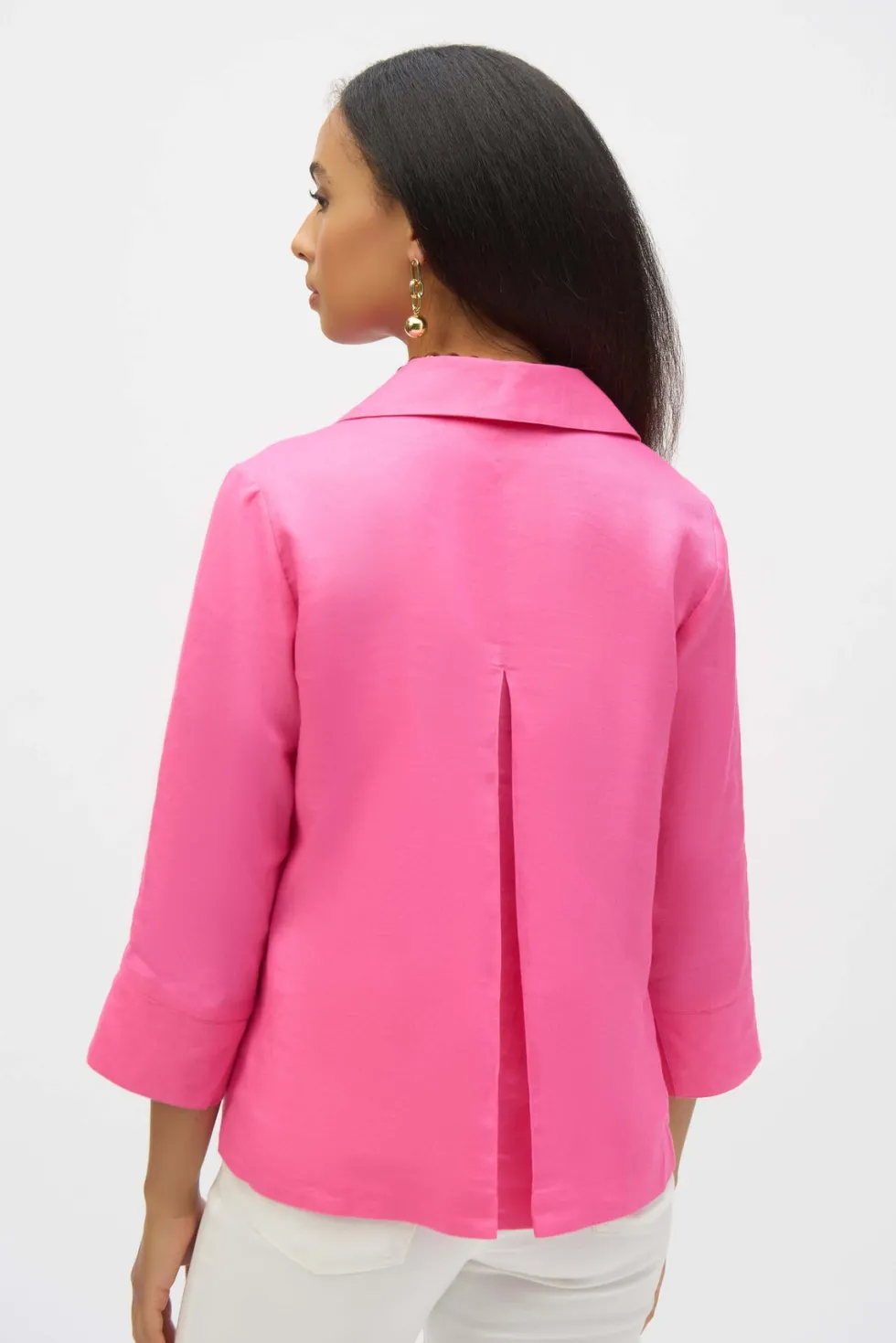Palm Springs Linen Boxy Top with Shirt Collar – Bubble Gum -252933 Cut from a lightweight and breathable linen fabric, this relaxed top offers comfort and style thanks to its understated details. The polo-esque shirt collar, crossover slit at the cuffs, and soft back pleat give this piece a unique look that's easy to l