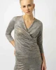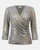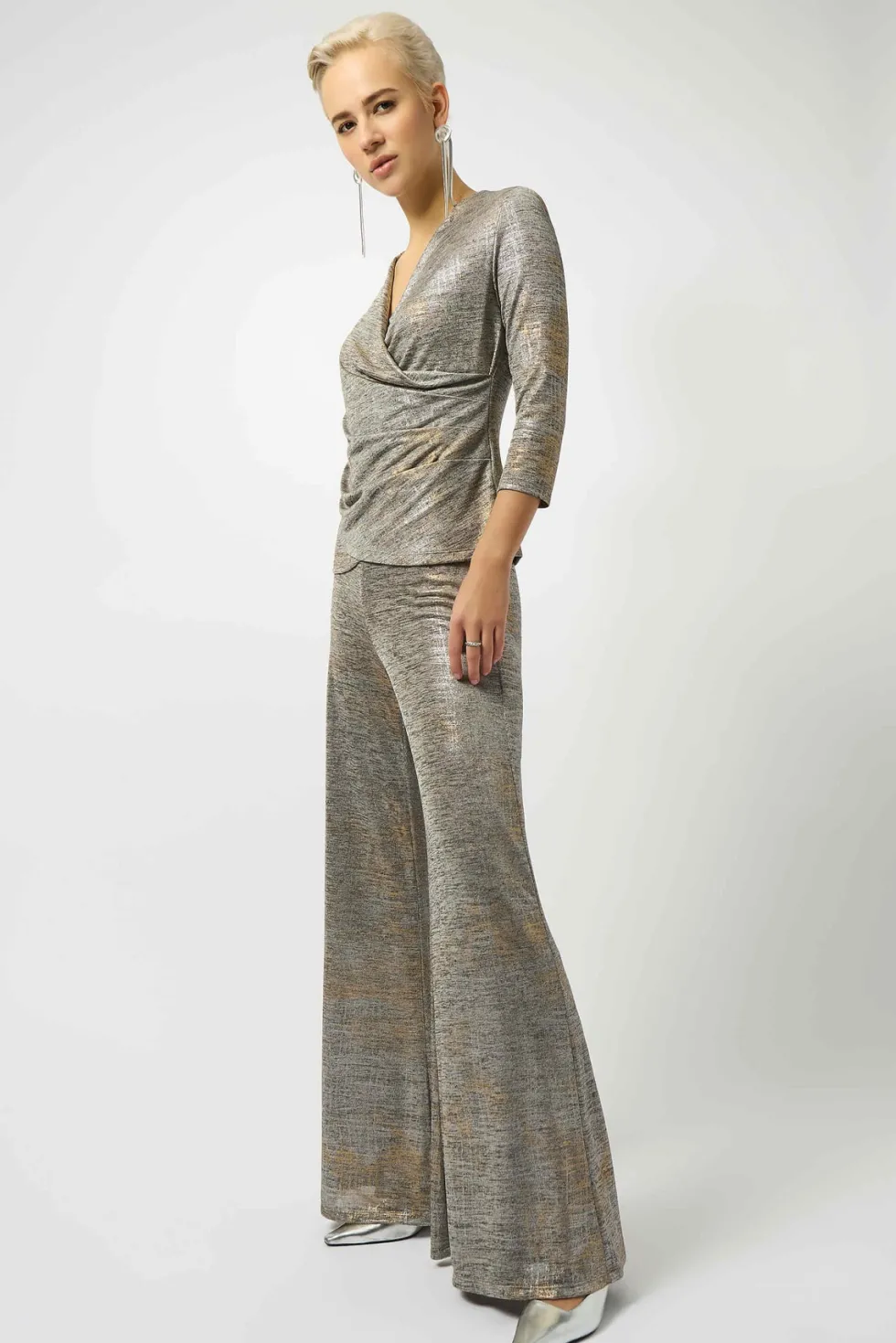 Supernatural Foiled Mélange Knit Wrap Top – Beige 253087 by Joseph Ribkoff at The Wardrobe Showcase your distinctive style with this striking foiled mélange knit top. The wrap neckline adds a sophisticated twist, while the abstract print lends a dramatic flair to the design. The three-quarter sleeves and front pleat de