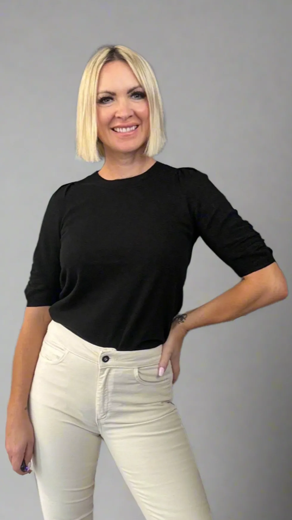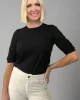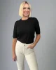 55% Extra fine Merino Wool (Ethically sourced) 45% Cotton Crew neck tee, in a merino blend, with ribbing detail and gathering on the shoulder, and ruching on the sleeve. Perfect as a layering piece.