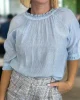 Chroma Tee – Blue 1377 by Madly Sweetly at The Wardrobe Relaxed top with a raglan sleeve, featuring small ruffles around the neckline and  elasticated sleeve cuffs. 80% Rayon, 20% Nylon Gentle cold machine wash with like colours, using mild detergent. Do not rub/soak//wring/bleach. Do not tumble dry.