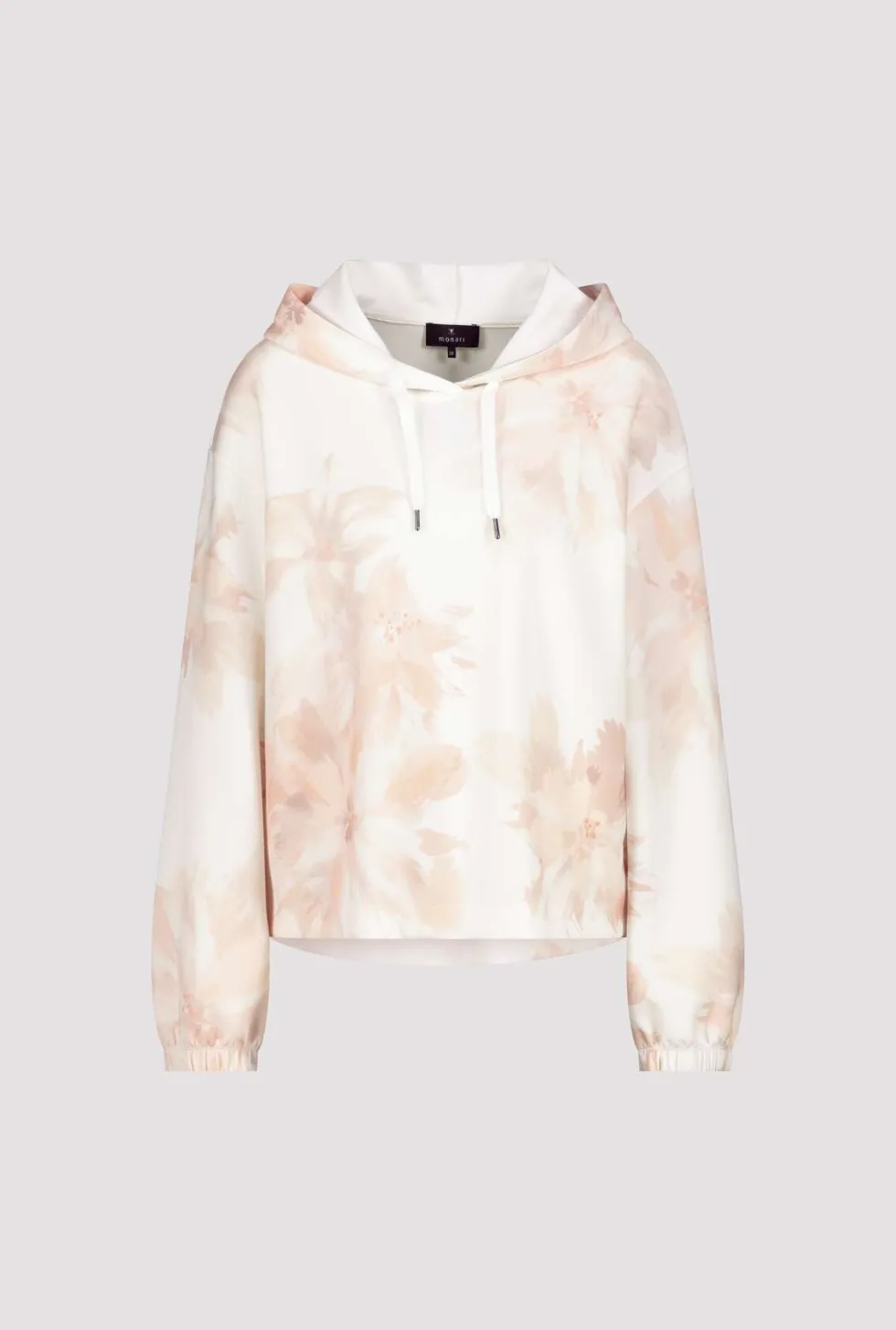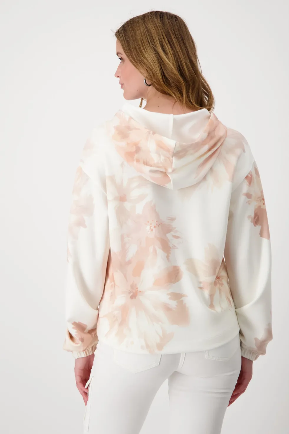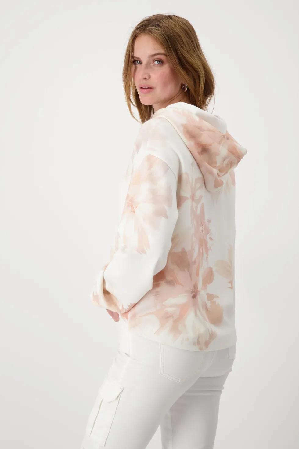 Peach Flower Hood Top 808074 by Monari at The Wardrobe. 52% modal; 42% polyester; 6% elastane Modal blend; Elastic material; Sweatshirt; Soft feel; All-over floral pattern. Regular fit; Hood with cord; Long sleeves; Elasticated sleeve hem; Extended,rounded back. Wash on wool program/With similar colours.