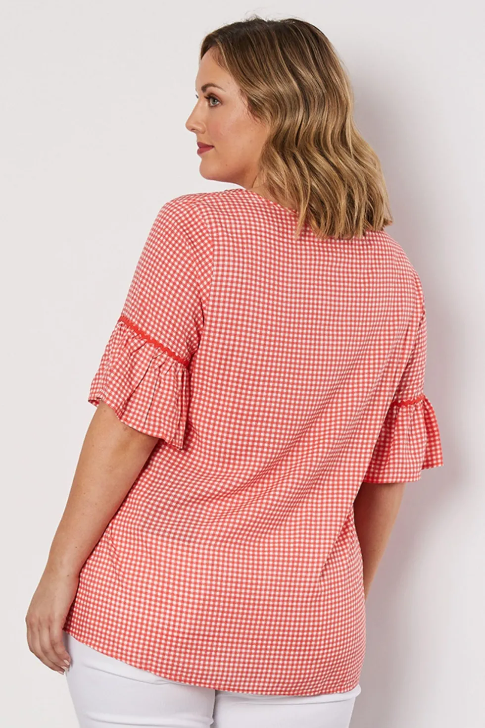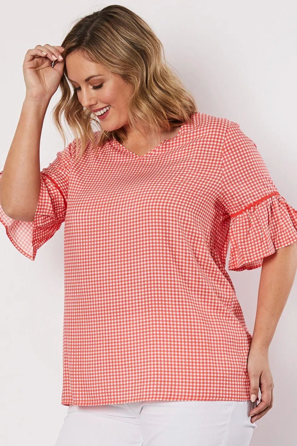 Not sure what to wear? We've got you covered! These tops are perfect for any occasion and can be paired with jeans or leggings. The Threadz ruffle sleeve top will add some femininity while also being versatile in your everyday wardrobe collection. V neckline 100% Viscose Ruffle sleeve Longline Straight fit Check print