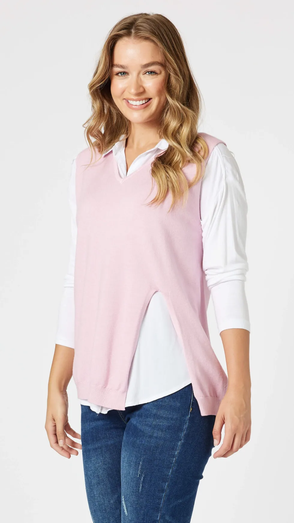 Vicky Side Split Knit Vest – Pink 44373 by Threadz at The Wardrobe Our Best Selling Knit Vest is back and finally available in more colours! If you were lucky enough to get a black one last year, make way for the best basic you could add to your wardrobe. This SUPER SOFT knit is perfect for layering over plain or print