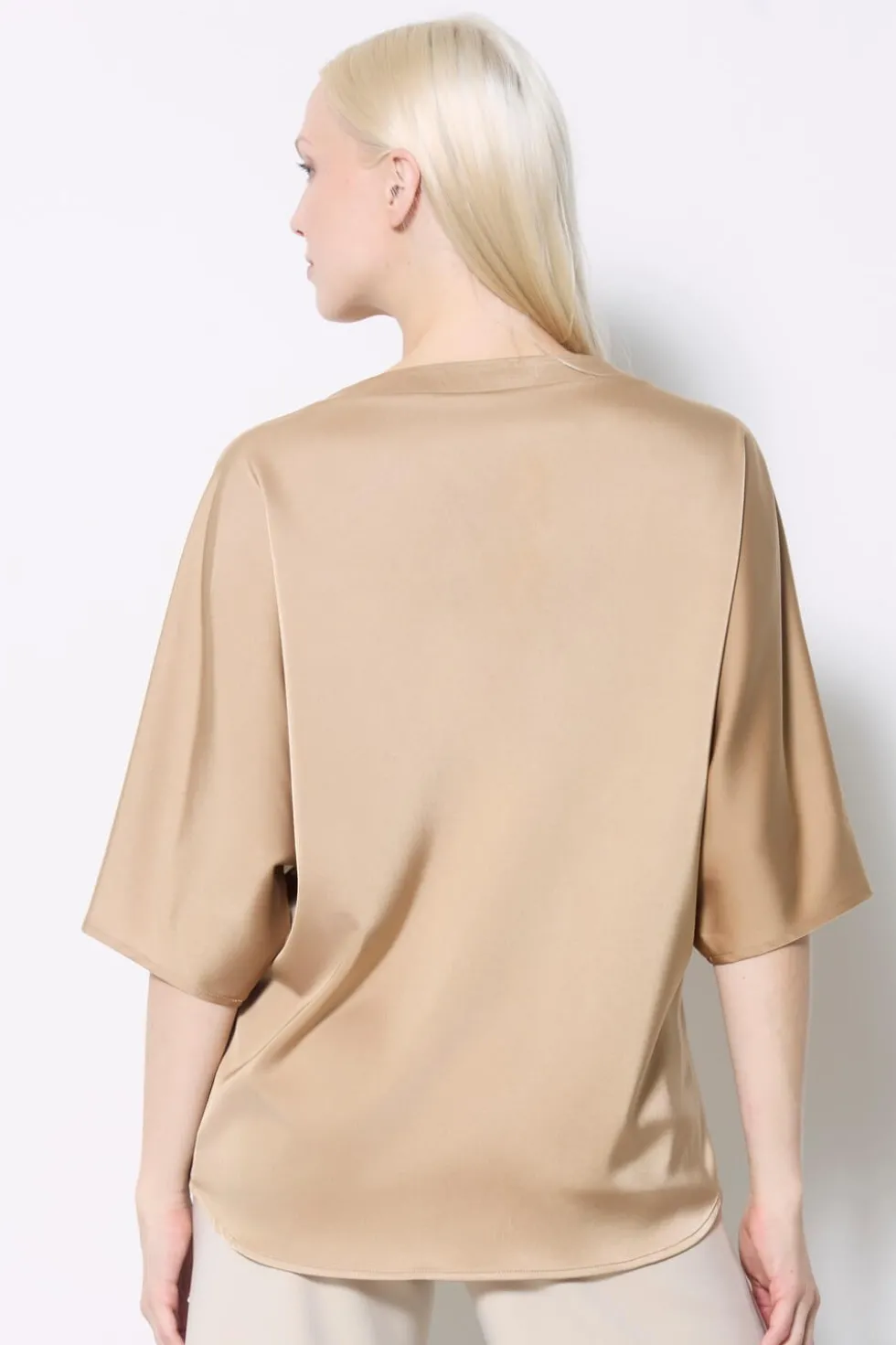 Belize Short Sleeve V Neck Top – Champagne 30404 by Up Pants! at the Wardrobe topIndulge in the decadent softness of Belize satin. Boasting an elegant sheen and a languid silhouette, this lush piece flows effortlessly around the body in a demure embrace. An alluring V-neck adds a sultry dose of feminine chic, injecting