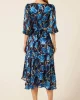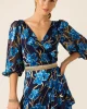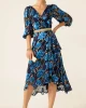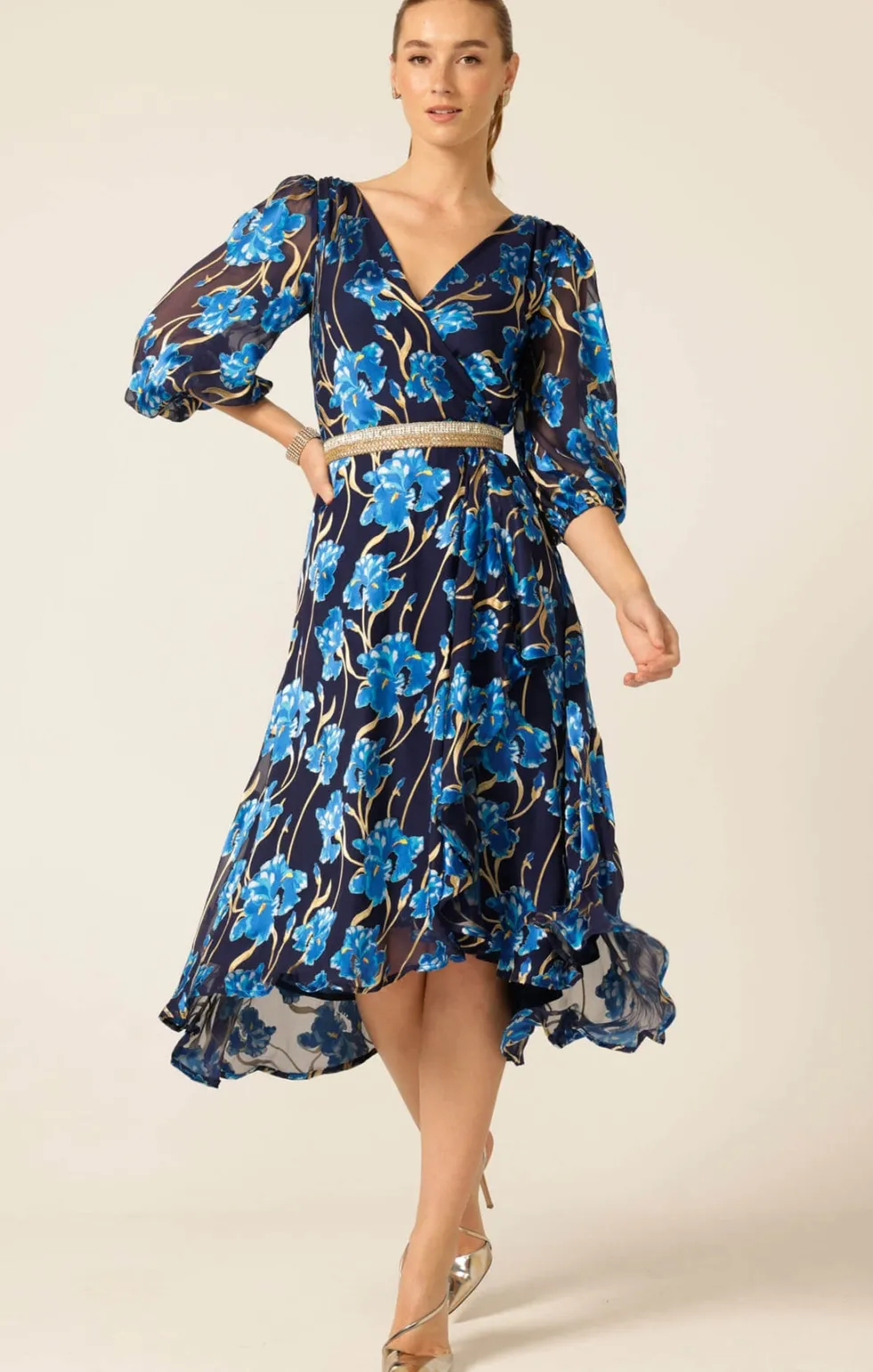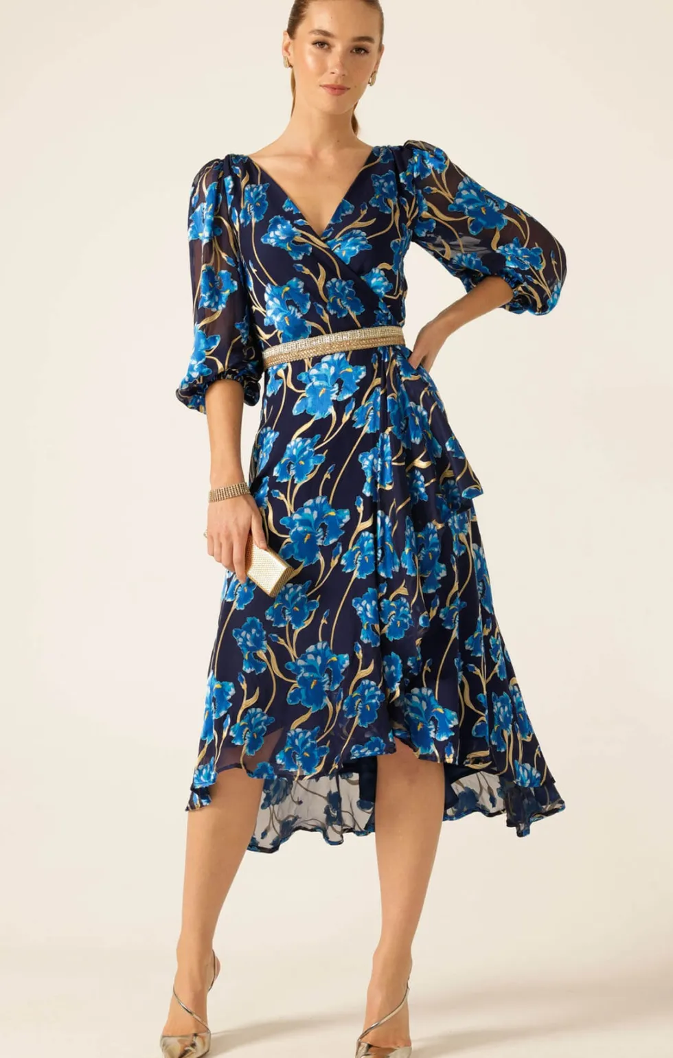 Linnee Wrap Midi Dress D17S25 – Blue Iris by Sacha Drake at The Wardrobe The Linnee Wrap Dress is made from a luxurious silk rayon blend and showcases SACHA DRAKE’s iconic wrap design in an exclusive print. Featuring bloused sleeves, a flattering A-line hi-lo silhouette, and a detachable sequin belt, this midi dress i