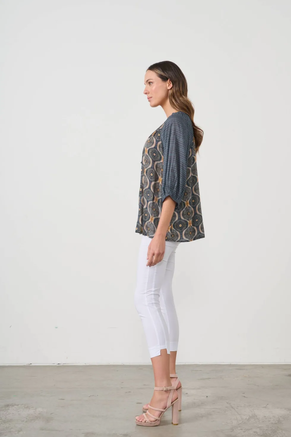 Kosmos Print Blouse CZ1015 by Caju at The Wardrobe . Soft and floaty material Special beaded tassels Elastic wide cuffs Raglan sleeve Best selling blouse shape Special double print Relaxed fit Designed in Australia 100% Viscose Modal
