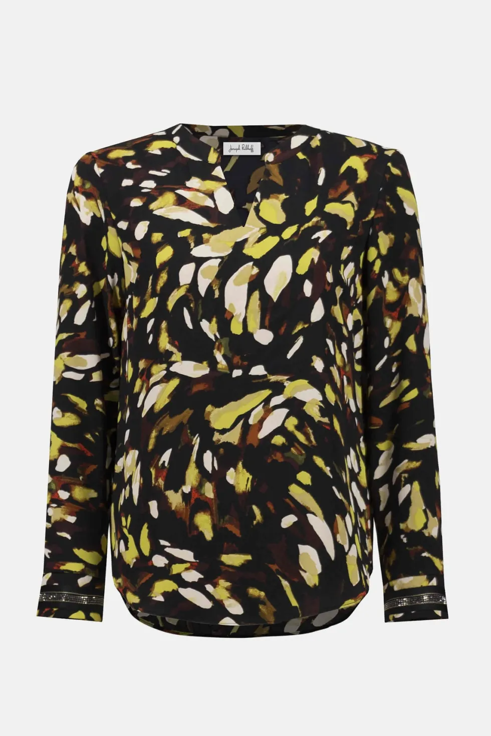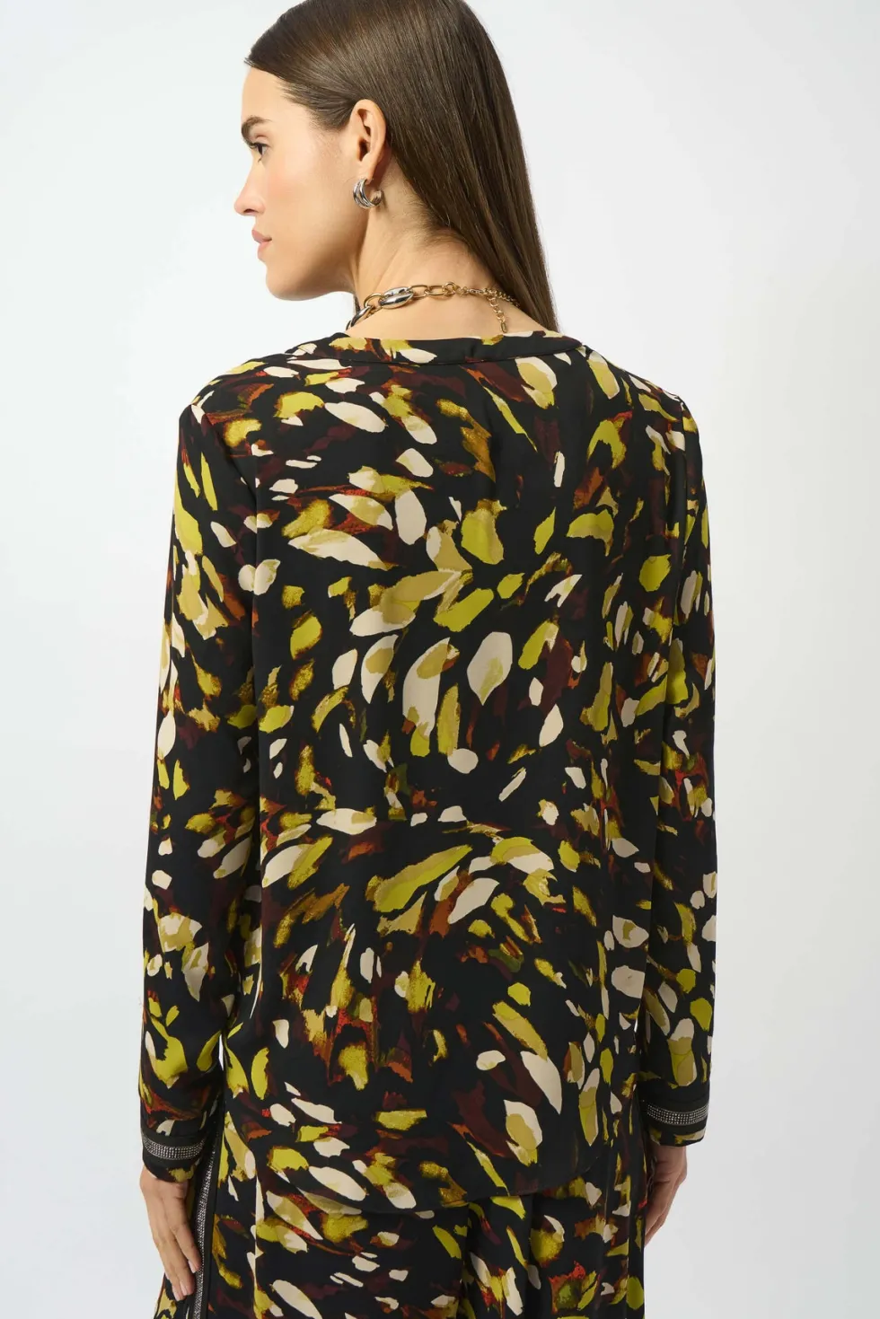 Supernatrual Recycled Soft Twill Animal Print Blouse 253259 by Joseph Ribkoff at The Wardrobe. Embrace your bold side with our striking animal print top, featuring a contemporary mandarin collar and a flattering, curved hem. Long cuffed sleeves frame this standout piece, crafted from a lightweight recycled twill fabric