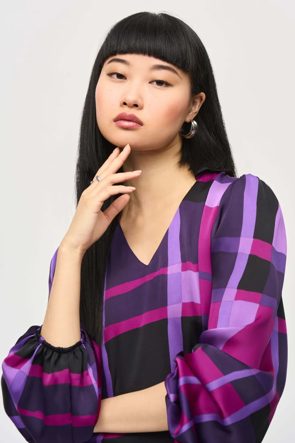 Liberty Satin Abstract Plaid Print Top 243058 by Jospeh Ribkoff at The Wardrobe This is a sale item and is only eligible to return for a store credit or exchange.The essence of contemporary style, this satin top carries undeniable charm. The design features an alluring abstract plaid print that highlights your flair