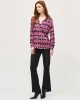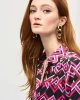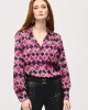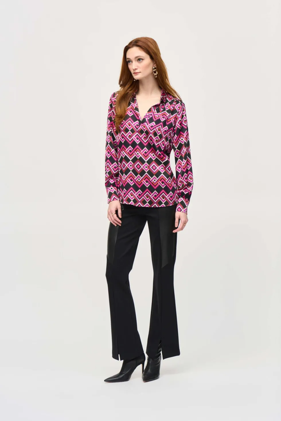 This is a sale item and is only eligible to return for a store credit or exchange. Add bold contemporary flair to your every day look with this exquisite satin top. This garment serves understated elegance with its lively geometric print, elevating the garment’s classic straight silhouette. The shirt collar and long pu