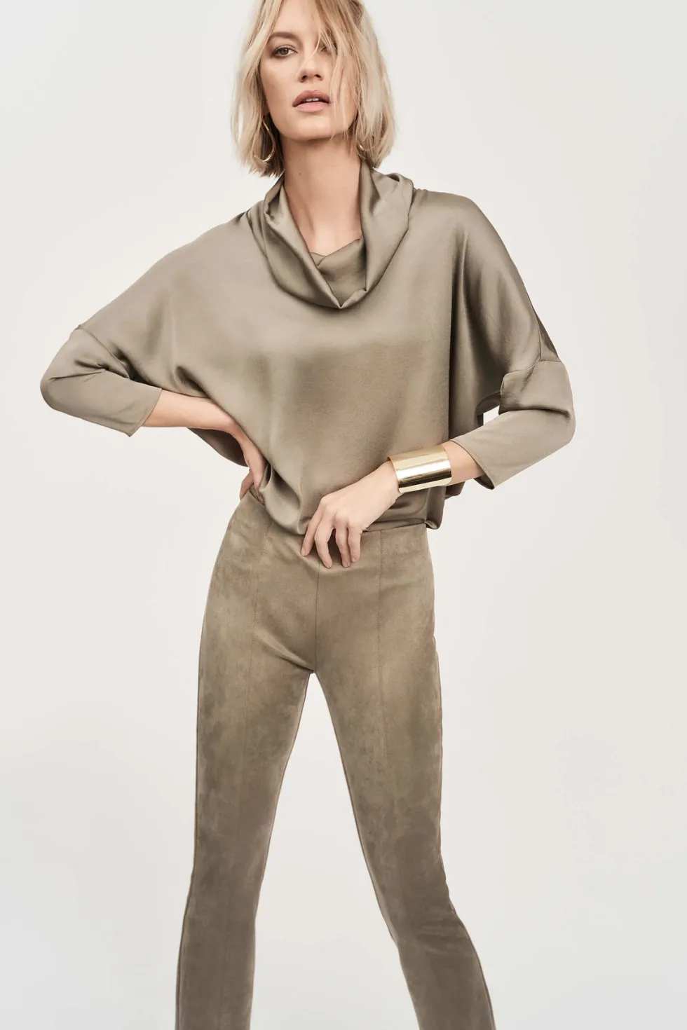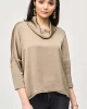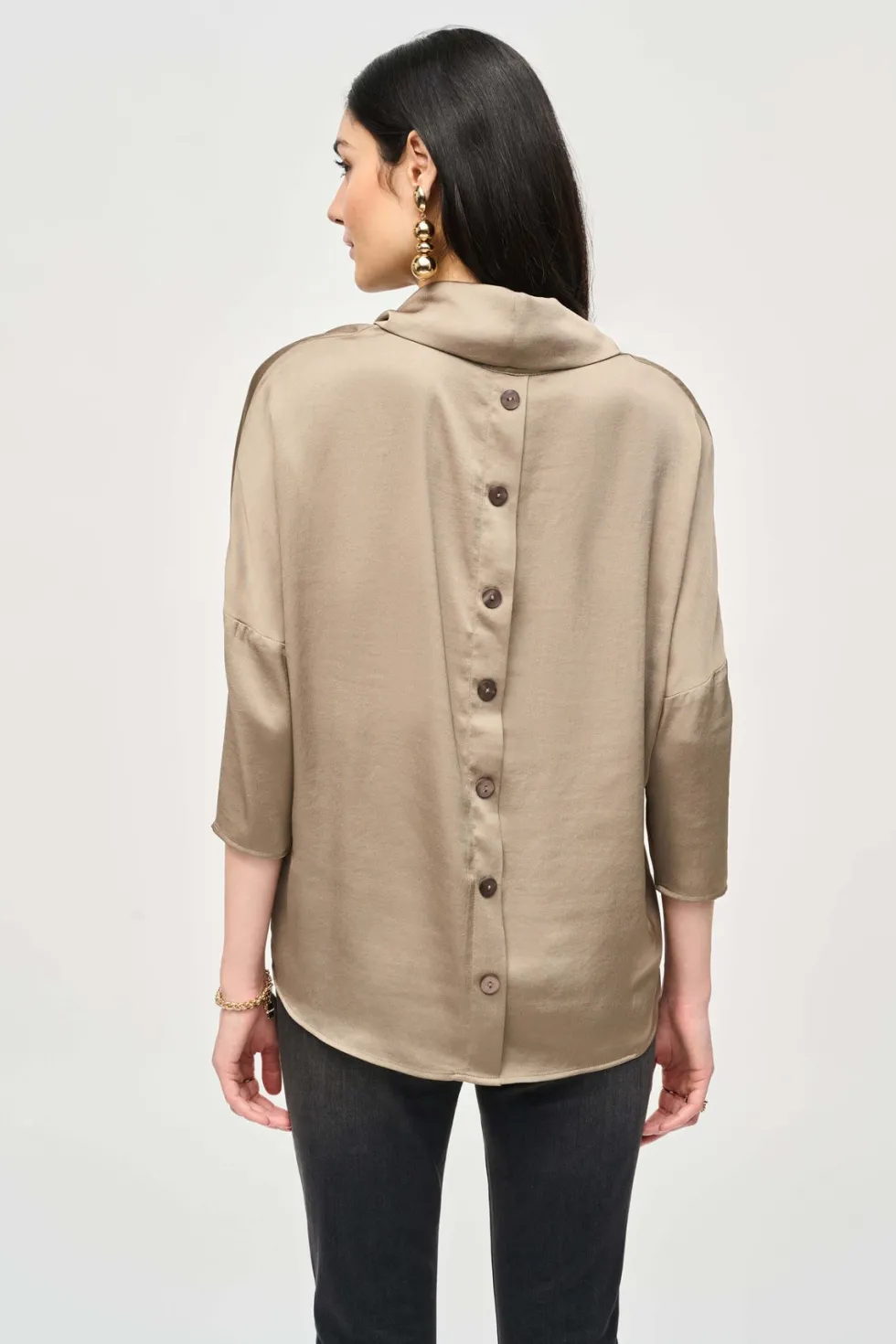 This is a sale item and is only eligible to return for a store credit or exchange. Crafted from lustrous satin, this top exudes a rich appeal that speaks volumes of your refined taste. The unique high-low cut and the detail of the faux placket add a contemporary twist, while the cowl neck and buttoned long sleeves en