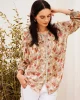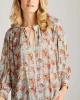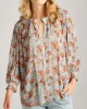 Holly Top – Seafoam 3408 by Lania The Label at The Wardrobe Gathers around the shoulders and sleeves add a soft fluidity to the Holly Top. This elevated style features a delicate and feminine floral print, contrast binding and tie details at the centre front. The shirred cuff with contrast embroidery thread detail adds