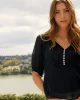 Lottie Top – Ink 3878 by Lania The Label at The Wardrobe Step in to summer elegance with the Lottie Top, featuring a soft ruffle detailing on the collar and delicate buttons and loop neck opening add a romantic touch. Finished with sleeves adorned in shirred ruffle cuffs, this blouse is ideal for elevating an outfit. C