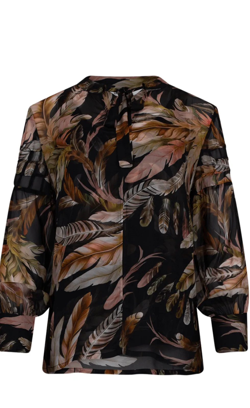 Featherington Blouse – Black Multi LS2946 by Loobie's Story at The Wardrobe. Sheer blouse with a centre front tie through collar channel to secure keyhole. Featuring tuck detail design on top sleeves with deep cuffs. Includes printed cami. 100% Viscose Cool hand wash using mild detergent. Do not machine wash, do not ru