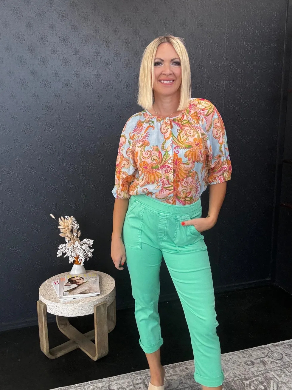 Round neck, button-through printed blouse with gathering around the neckline, and slightly puffed elbow length sleeves with soft undercased elasticated cuffs. Colours:Blue MultiComposition:100% RamieCare Instructions:Gentle cold machine wash with like colours using mild detergent. Do not rub/soak/wring/bleach. Do no