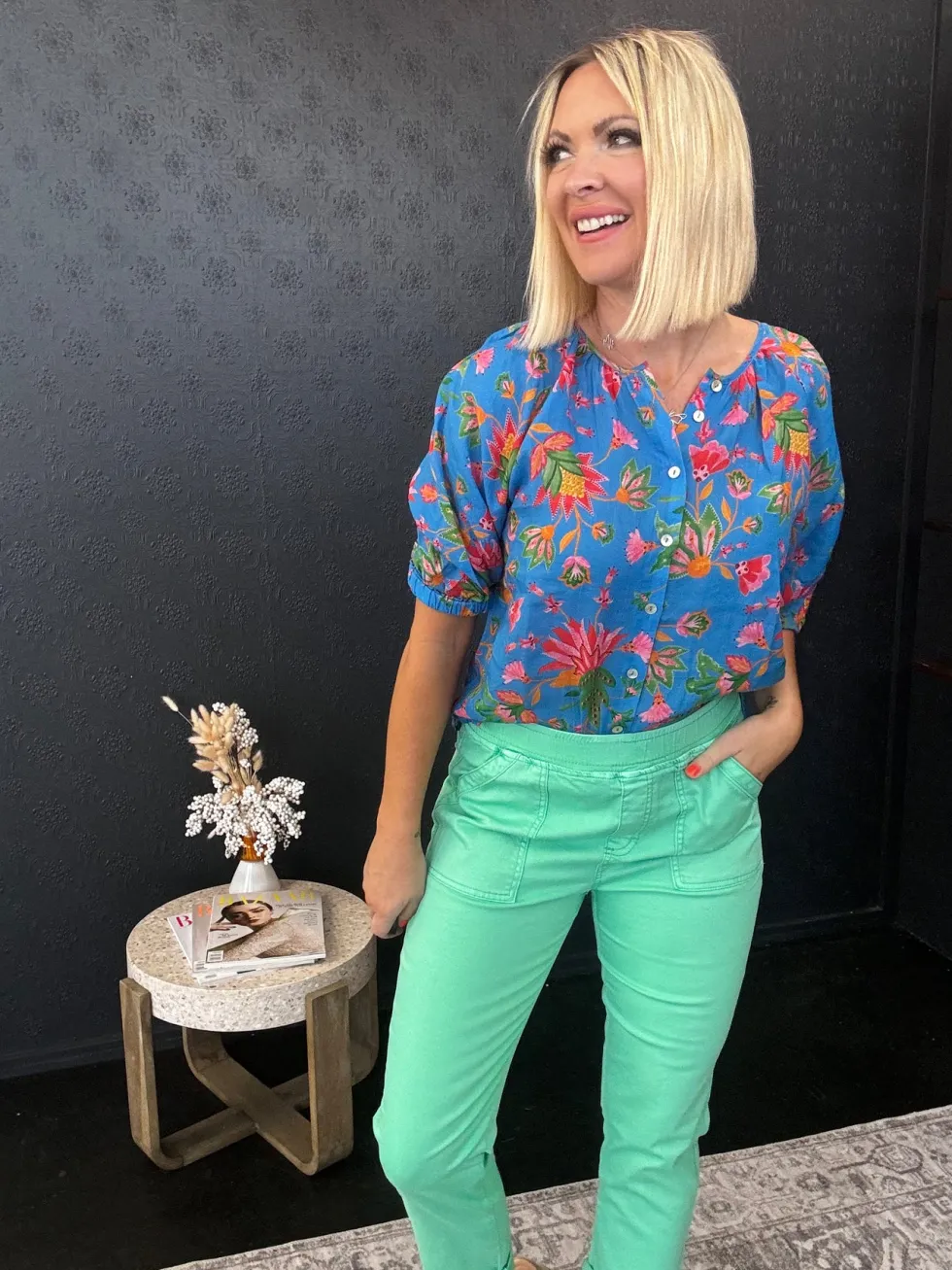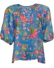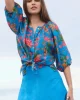 Round neck, button-through printed blouse with gathering around the neckline, and slightly puffed elbow length sleeves with soft undercased elasticated cuffs. Colours:Blue MultiComposition:100% RamieCare Instructions:Gentle cold machine wash with like colours using mild detergent. Do not rub/soak/wring/bleach. Do no