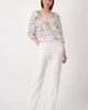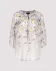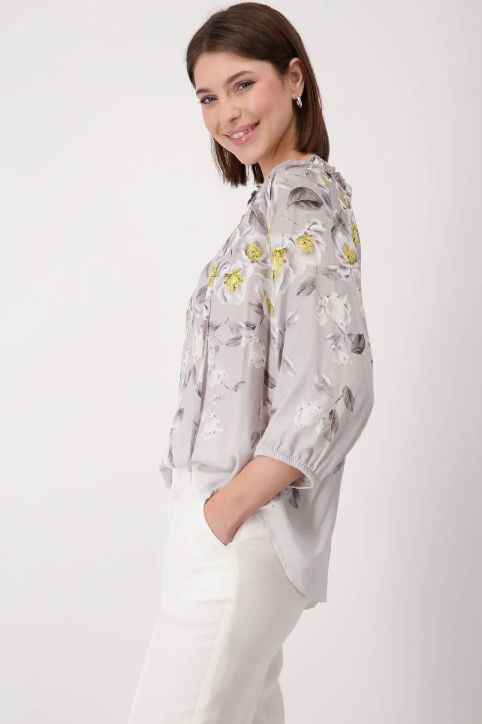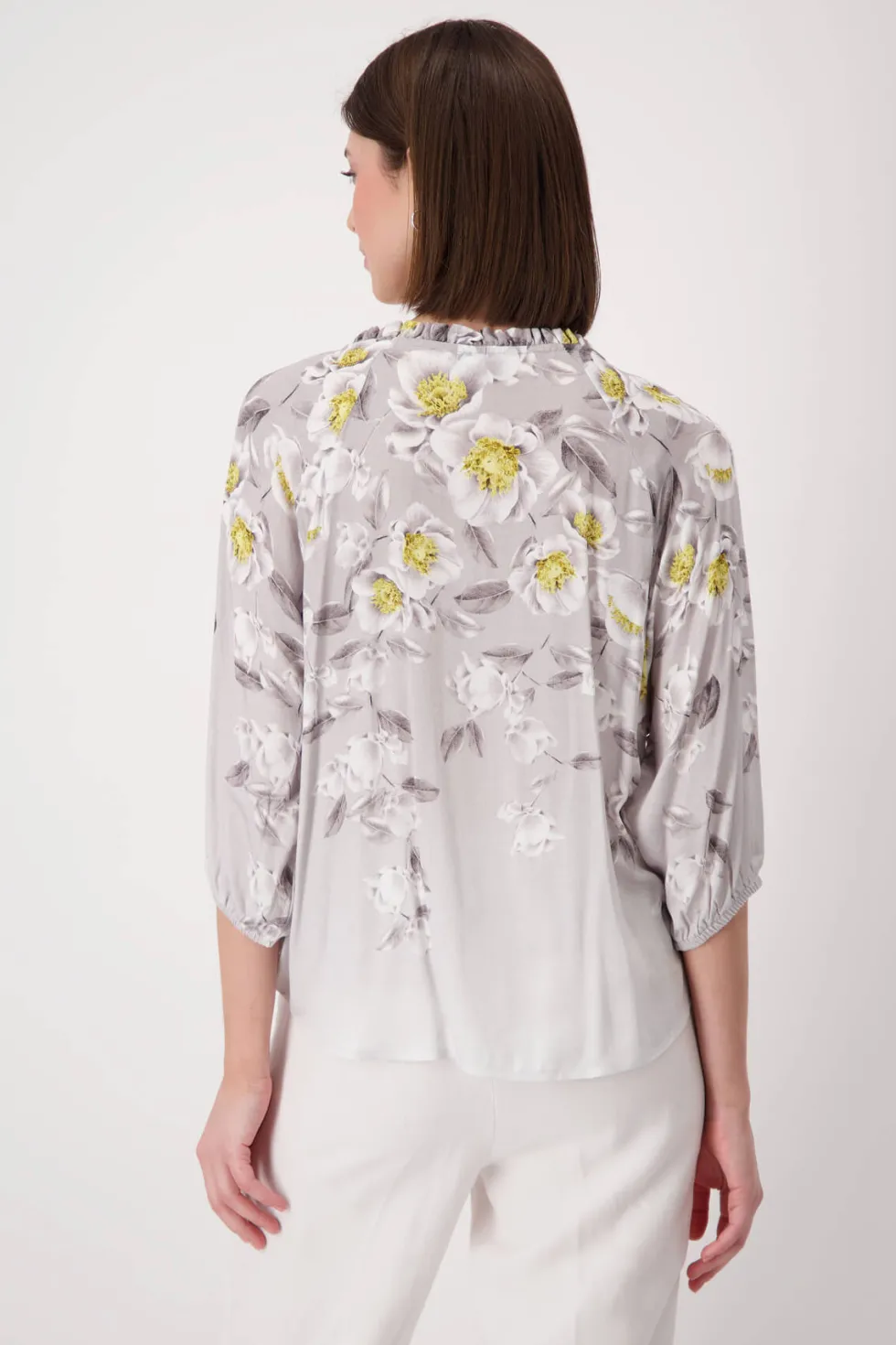 Flower Blouse 408665 by Monari at The Wardrobe. The blouse made of 100% viscose impresses with its all-over floral patternand the feminine round neck with slit and ruffles.