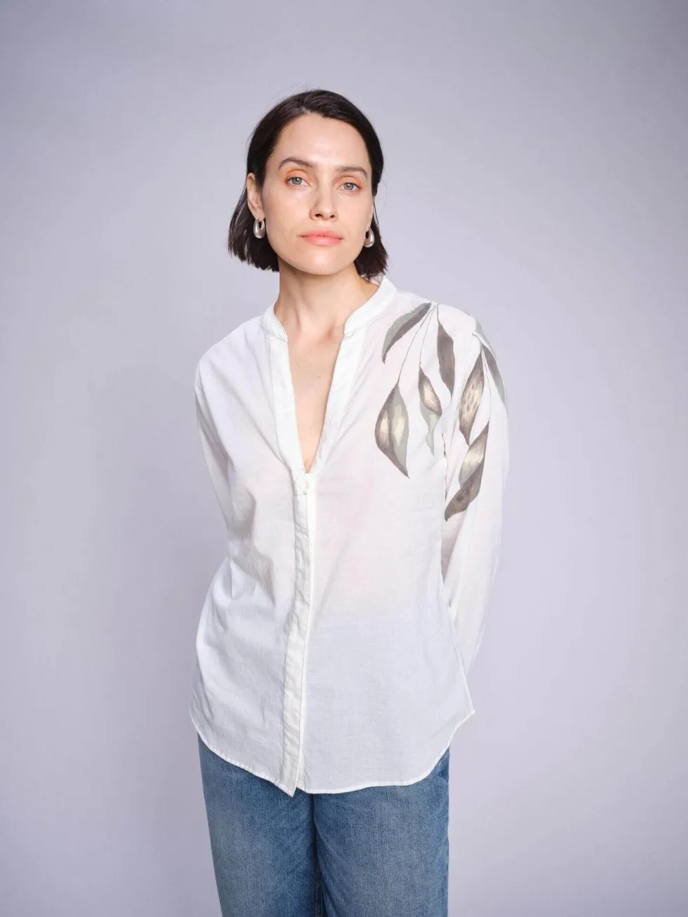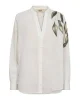 Gemran Flick Blouse 169850 by Mos Mosh at The Wardrobe. Stand out with this exclusively hand-painted blouse, crafted in a relaxed fit featuring an open neckline and concealed button closure. Each piece is uniquely hand-painted, ensuring every blouse is one-of-a-kind. Pair it with light-coloured tailored pants for a sop