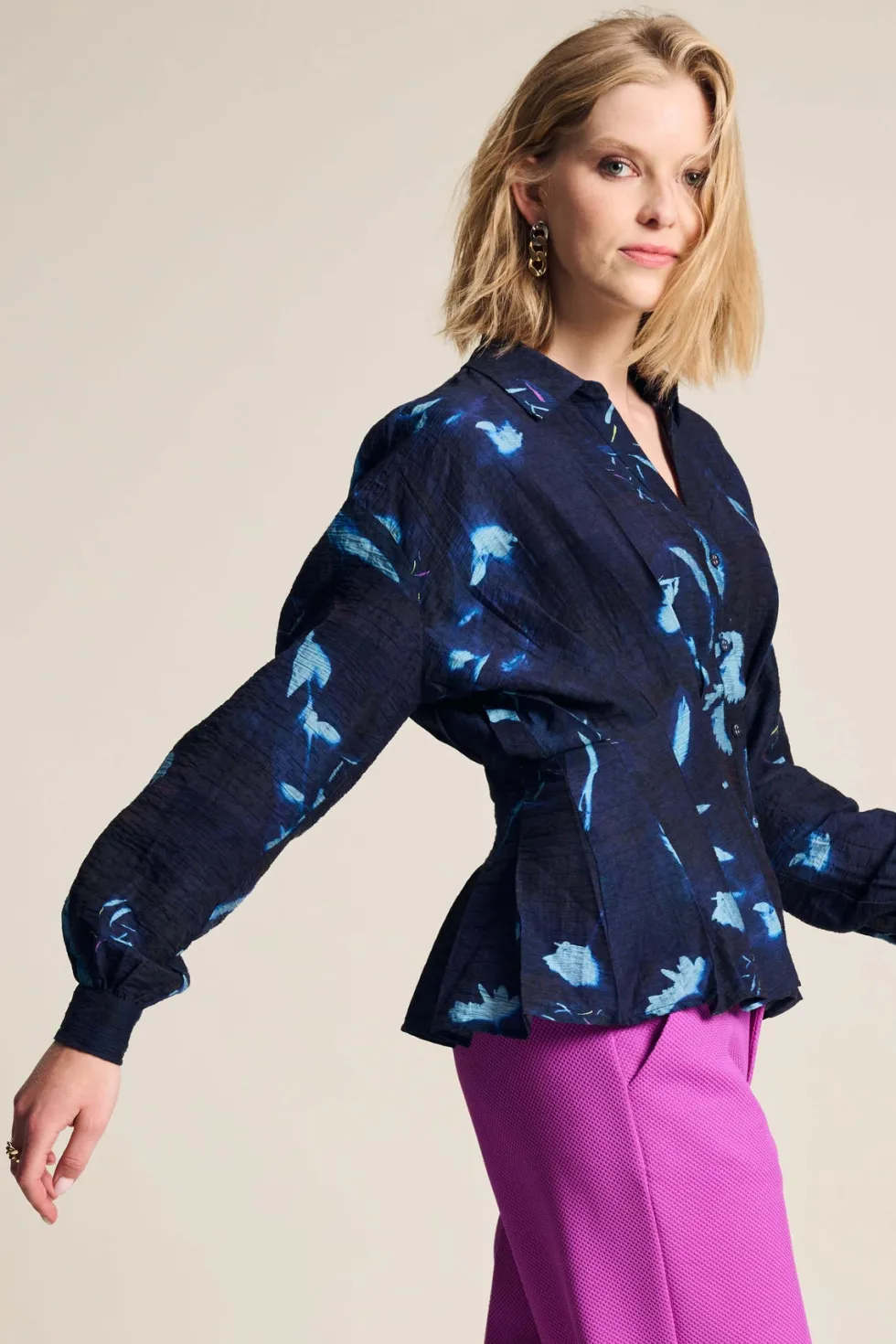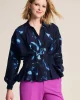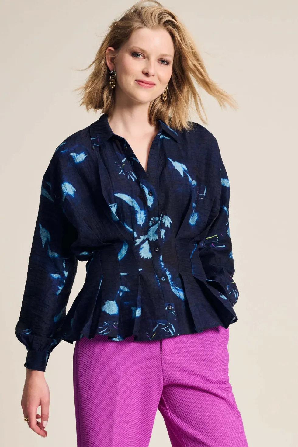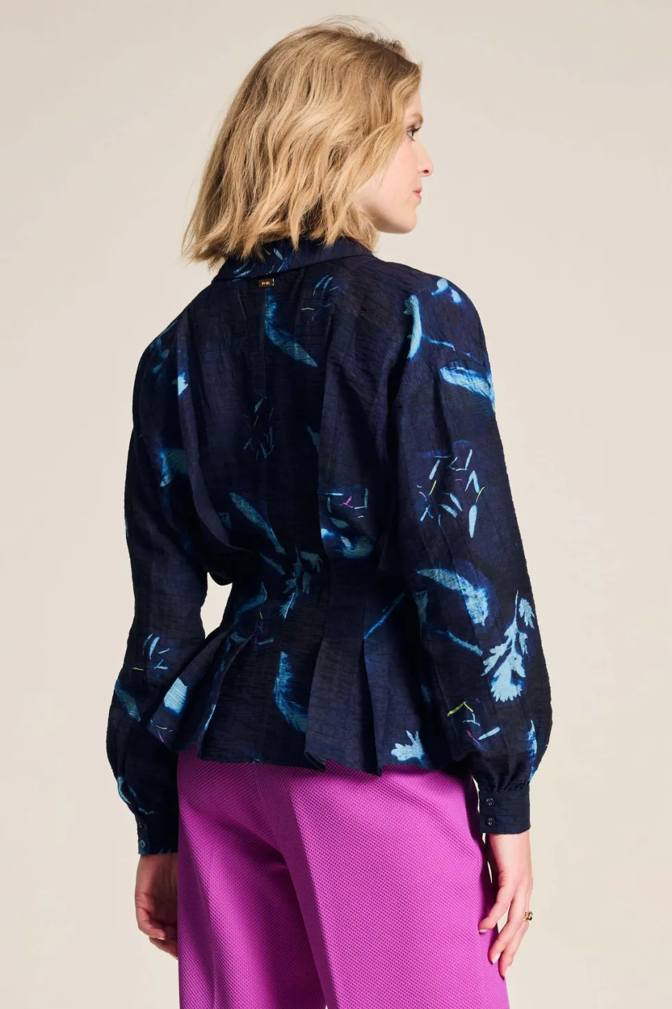 Feathers & Florals Blouse 7959 by Pom Amsterdam at The Wardrobe. This dark blue blouse features a unique feather print inspired by the many layers of a feather. The blouse has a V-neckline and is finished with pleats that accentuate the waist. This is a more sustainable item.