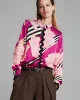 Taylor Blouse 7907 by Pom Amsterdam at The Wardrobe. This beautiful pink blouse features a floral print with black and white stripe pattern. The print was designed by fashion designer Claes Iversen. The blouse has a beautiful finish on the neckline typical of Claes' designs. The blind button row has an elegant wave eff