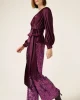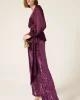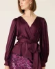 TheSatin Faux Wrap Top in Black Cherry by Sacha Drake at The Wardrobe,defines timeless design with its luxurious soft satin, flattering faux wrap design, and double-layered peplum. Featuring an elasticated waist, self-tie belt, and bloused sleeves with cuffs, this effortless pull-on style is perfect for both work or