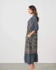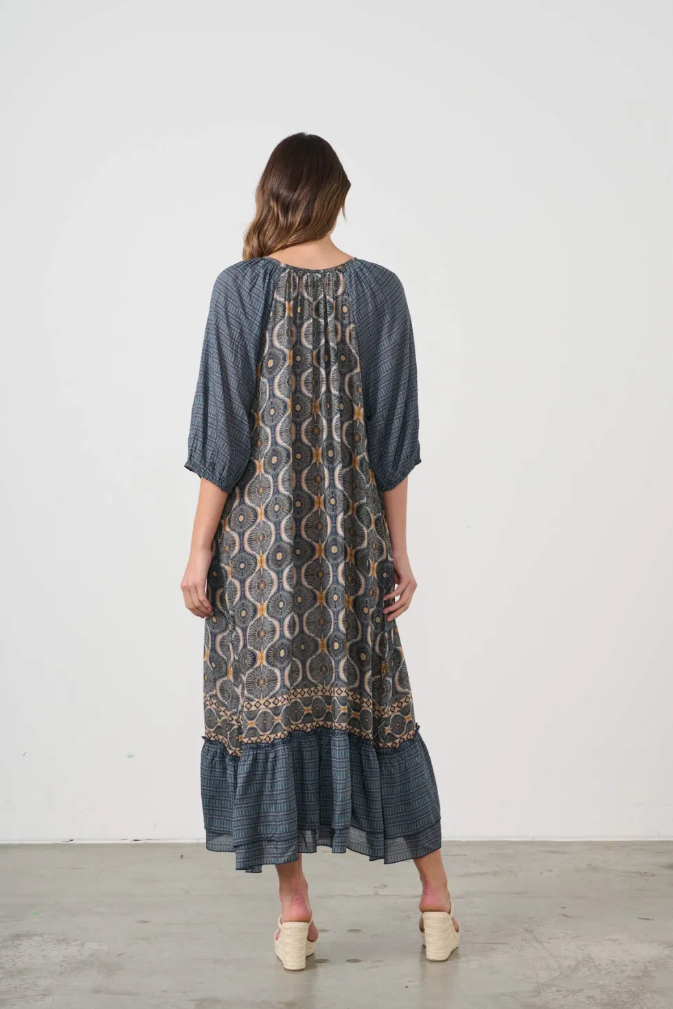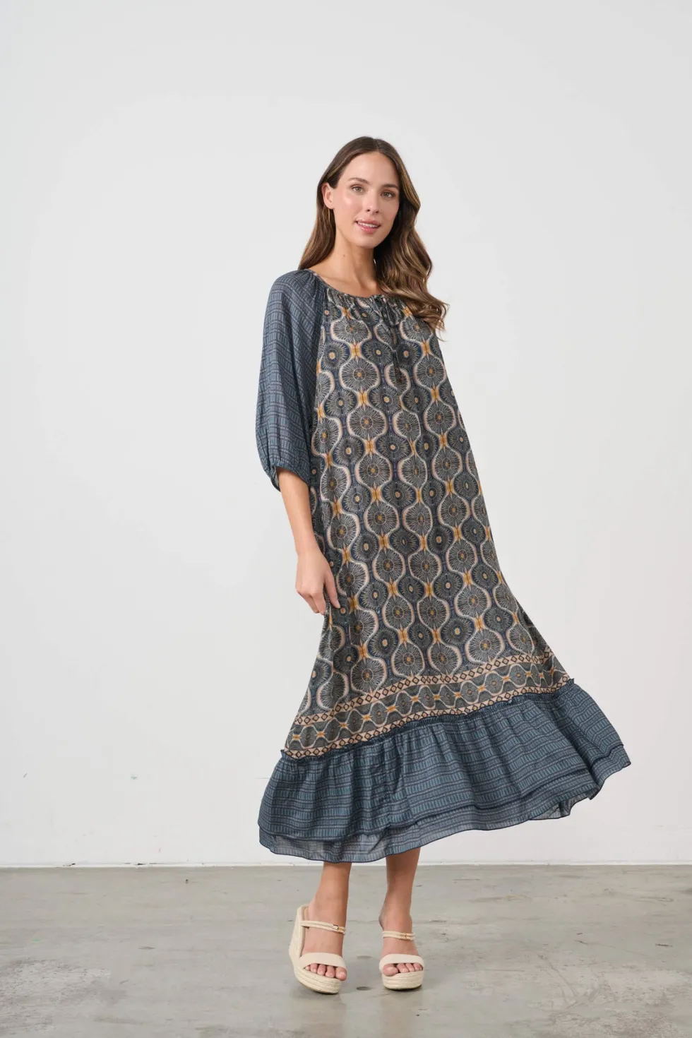 Kosmos Print Raglan Sleeve Dress CZ1018 by Caju at The Wardrobe . Soft and floaty material Special beadtassels Relaxed fit Side pockets Elastic cuffs Raglan sleeve Special double print Border print at hemline Double layer hemline Designed in Australia 100% Viscose Modal Lining: 100% Cotton