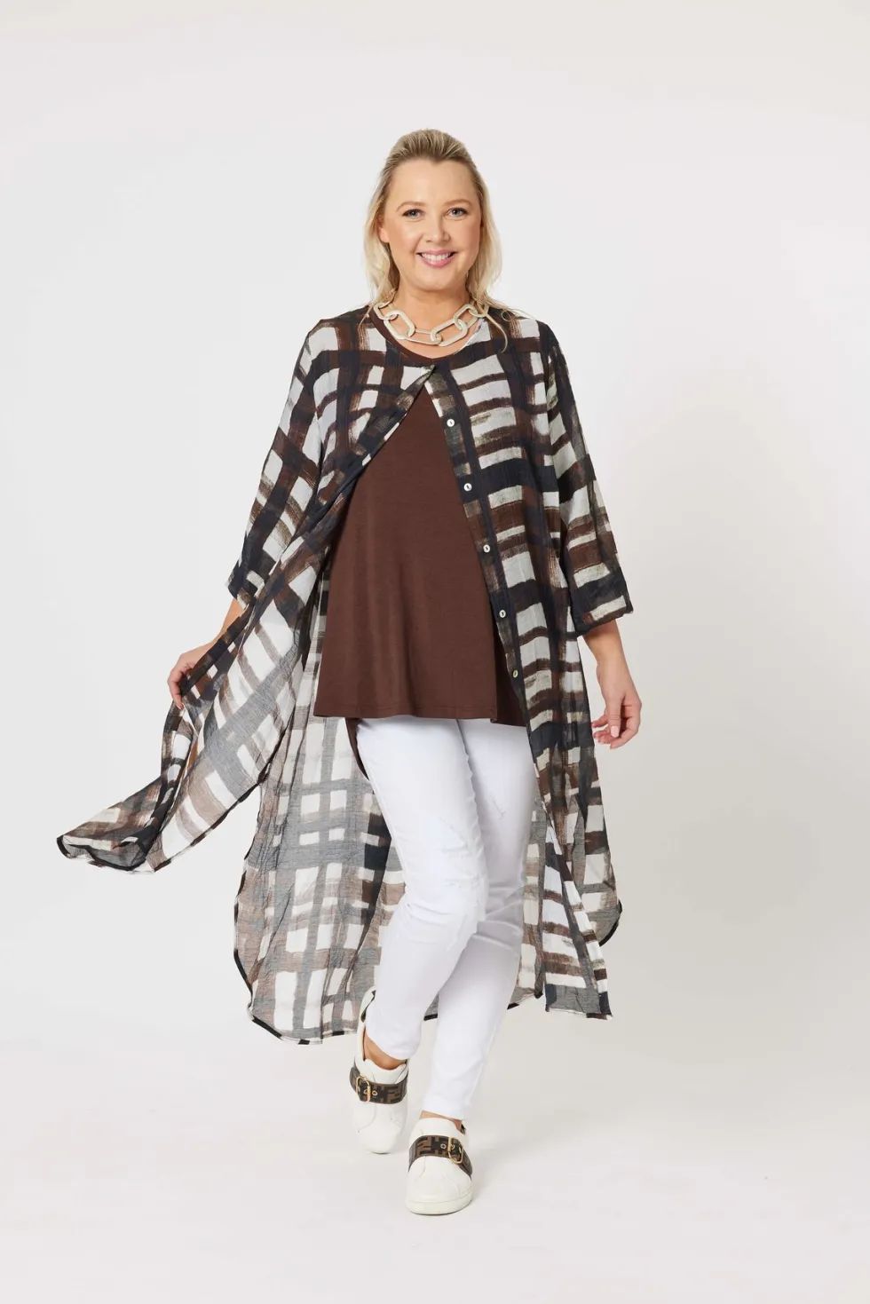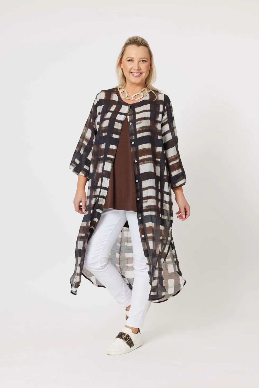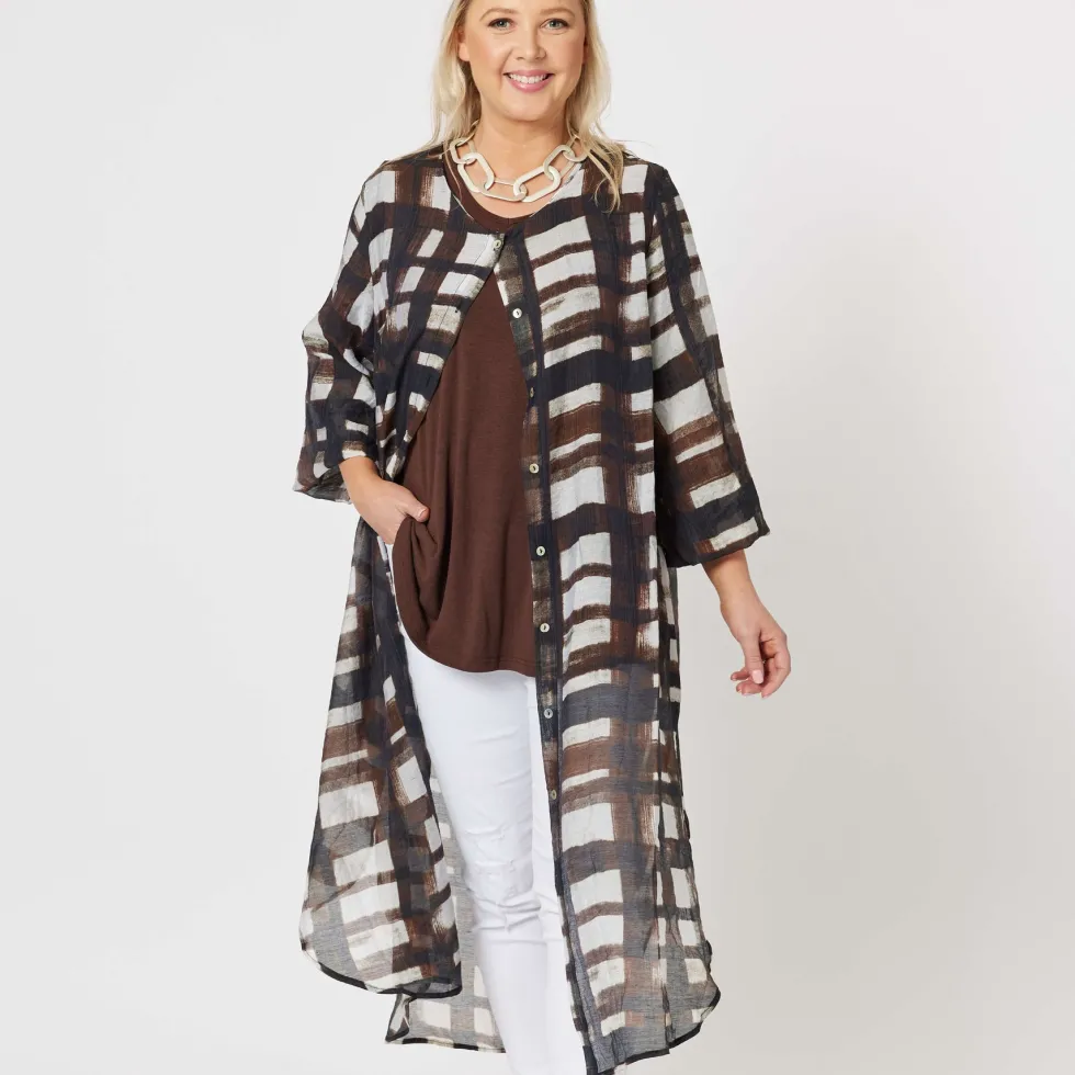 45308 – Zena Longline Shirt by Clarity at The Wardrobe Features: Viscose/Polyester Lightweight, flowy fit Collarless Side splits Matching self tie belt Fit Guide: Longline Long, tab up sleeve Relaxed fit Button up
