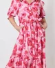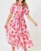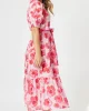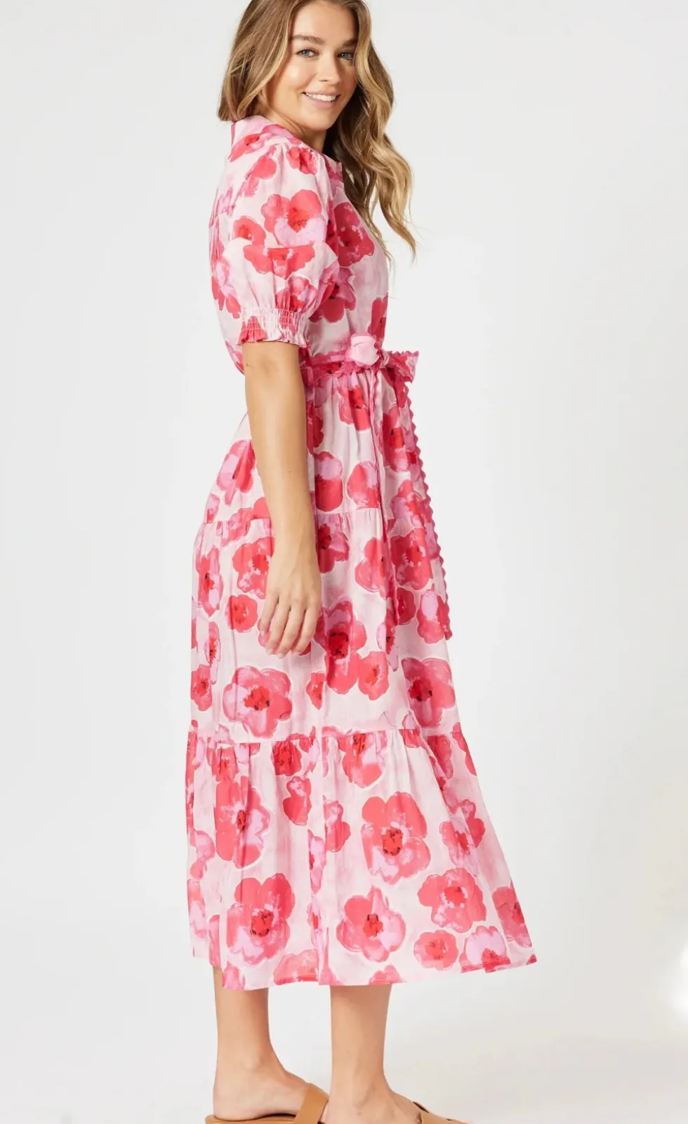 Pink Poppy Floral Midi Dress 48374 by Threadz at The Wardrobe Bring a fresh burst of colour to your wardrobe with the Pink Poppies Print Button Dress. Showcasing a vibrant pink poppy print on a soft blush base, this dress features a classic shirt collar, button-through front with ric rac trim, and short puff sleeves w