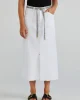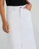 Rhode Skirt – White 3634 Lania The Label at The Wardrobe Elevate your denim collection with the Rhode Skirt, a midi-length design crafted with a contrast top-stitched panels for added detail. The bias-cut lower skirt and shaped back darts ensure an exceptionally flattering fit. Complete with a splits, featuring rive
