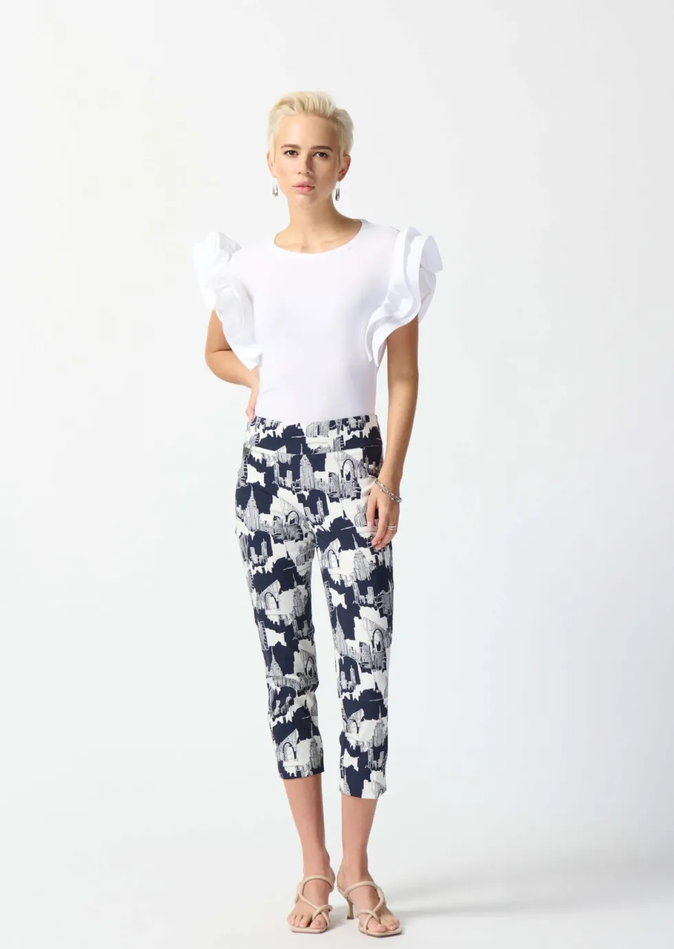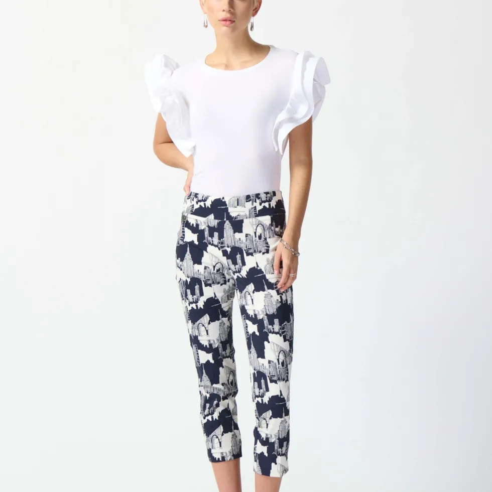 Seascape Millennium Scenery Pant 242212 by Joseph Ribkoff at The Wardrobe This is a sale item and is only eligible to return for a store credit or exchange. These millennium cropped pants are designed to embrace your form and complement your stride. This statement piece reveals a mesmerizing scenery print that marries