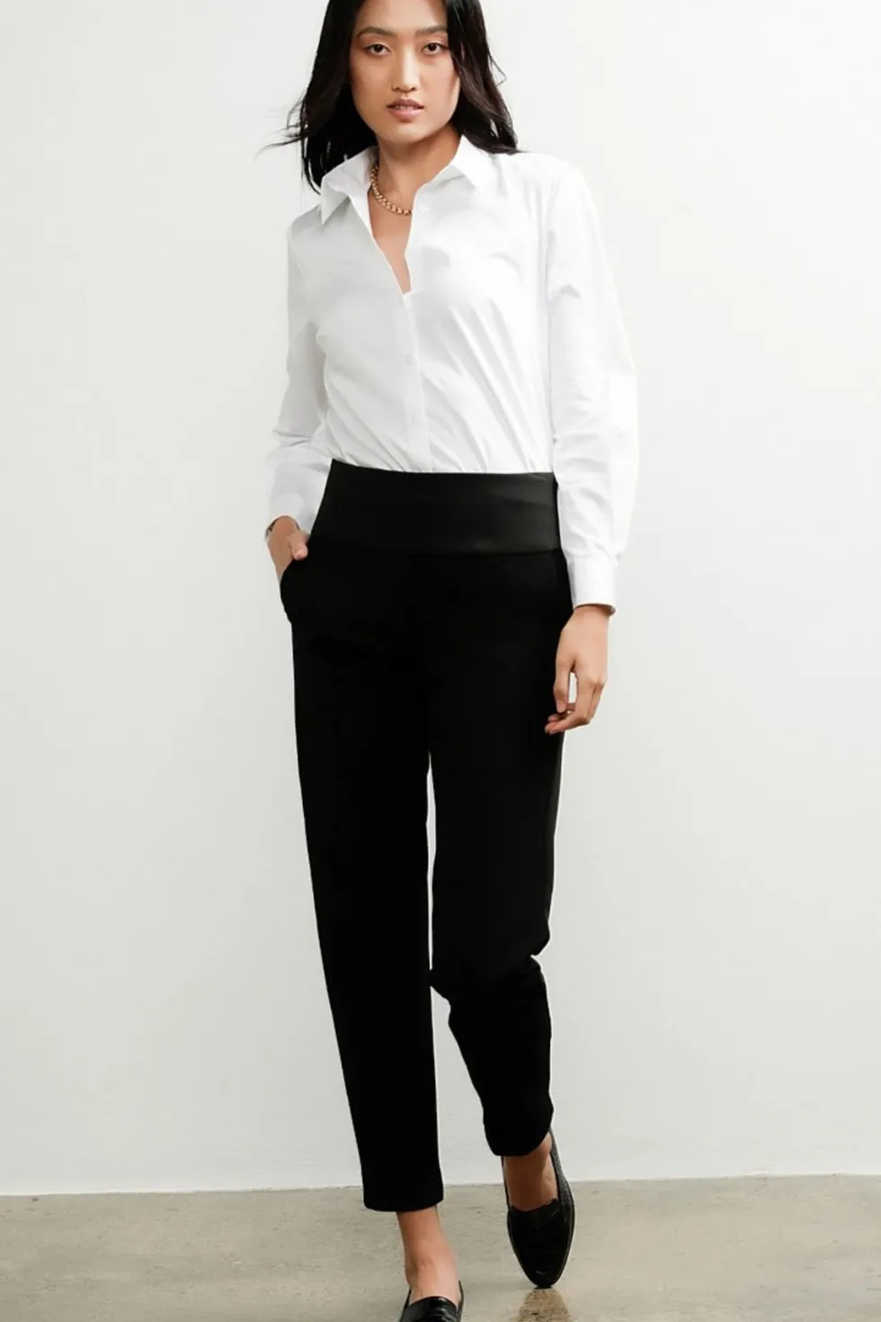 The Tapered Leg Pant is an indispensable staple that forms the foundation of any well-edited capsule wardrobe. Crafted from a lightweight fabrication, this pant is an easy pull on style with a tapered leg design that can effortlessly traverse from work to weekend. Pair with blouses and tops in or out, a blazer for work