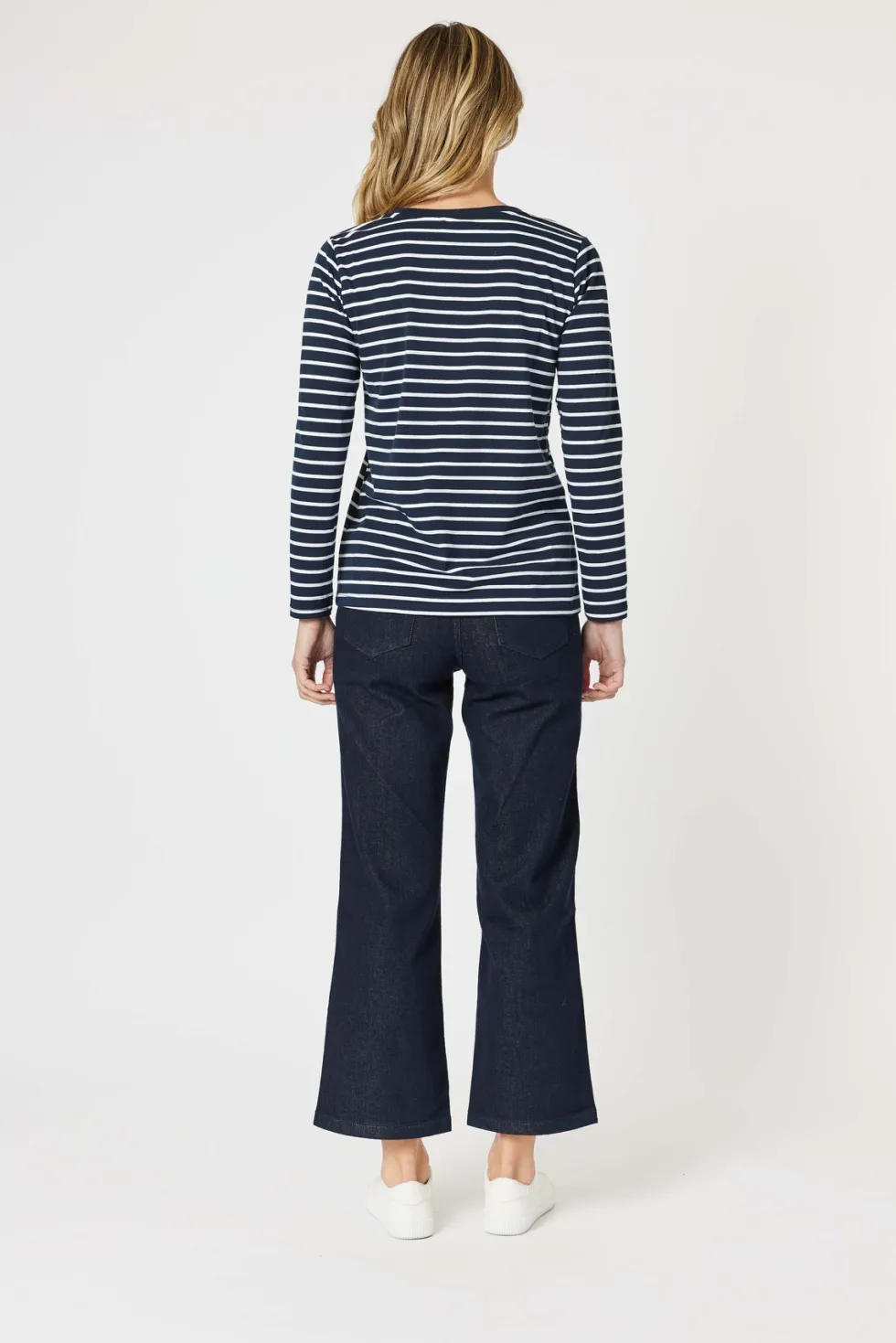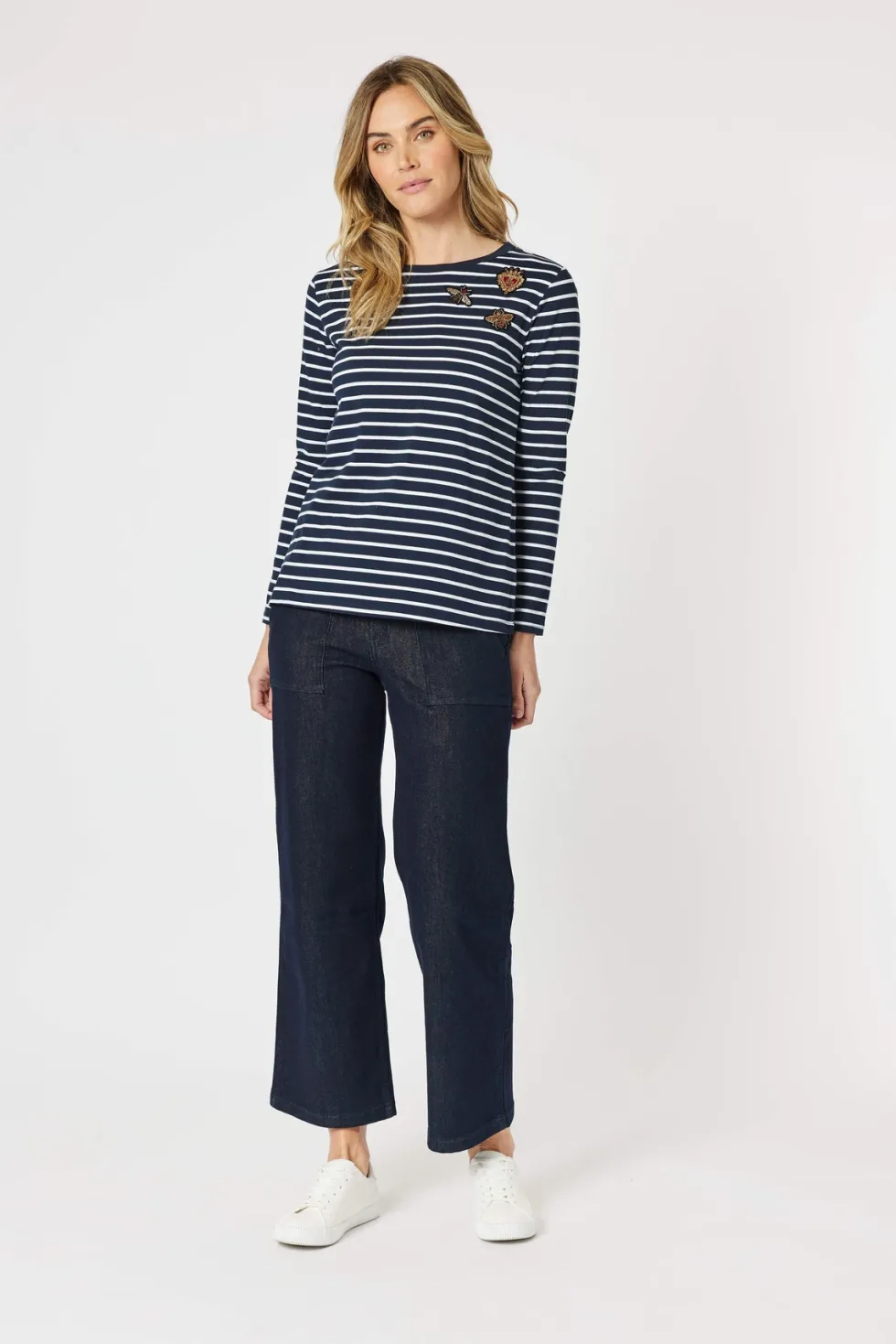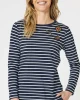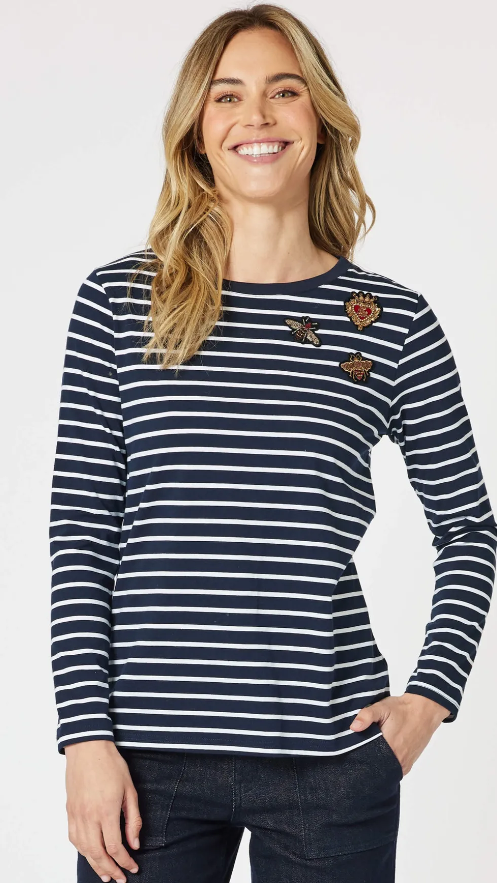 Striped Badge Detail Tee 42270 by Gordon Smith at The Wardrobe. Add some sparkle and flair to your wardrobe with the Badge Detail top, featuring stunning patch details embellished with sequins and beading. The stripes provide a classic touch, while the intricately designed patches offer a playful and glamorous finish.