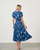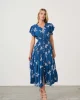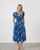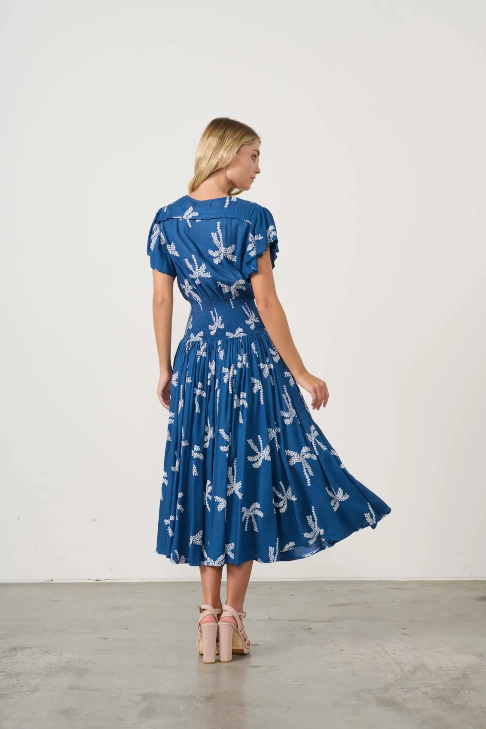 Palm Print Shirred Waist Dress HF2667 by Holmes and Fallon at The Wardrobe. Palms Print Special embroidered look print Button through Elastic shirred waist* Feminine ruffle sleeve Front & back special yoke panels Side pockets Relaxed fit Feminine v-neckline Cotton lined No stretch *Please note the waist shirring