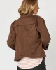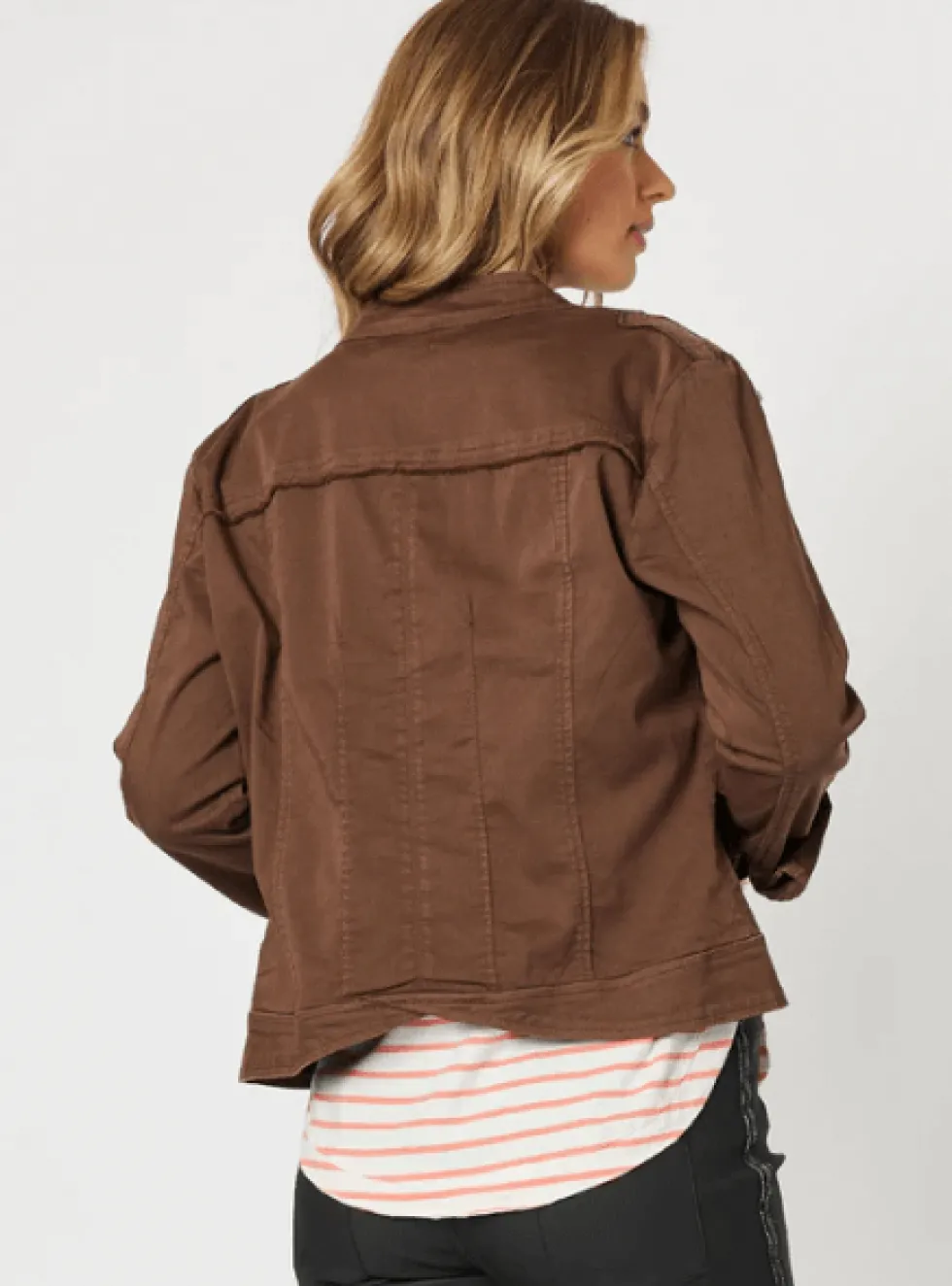 Military Style Denim Jacket – Chocolate 38706 by Threadz at The Wardrobe Quality cotton denim Soft washed look Fringe detailing on the front and back yoke Sparkle trim detail at the epaulettes and down the centre front placket Bronze hardware Nehru style collar with snap fastener Shaped fit Extra stretch for Easy layer