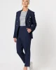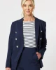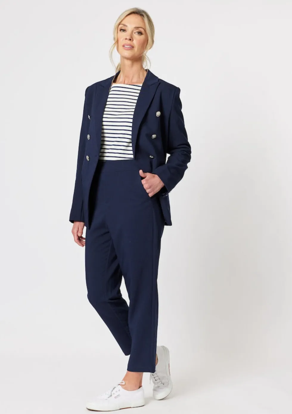 Lauren Blazer – Navy 41862 by Gordon Smith at The Wardrobe. 78% Polyester / 18% Viscose / 4% Elastane Classic blazer Lining through body, not arms, for good range of movement Double breasted Structured shoulder pads Silver crest embossed buttons Welted pockets with flaps Styled in stretch woven fabric Model is 173cm