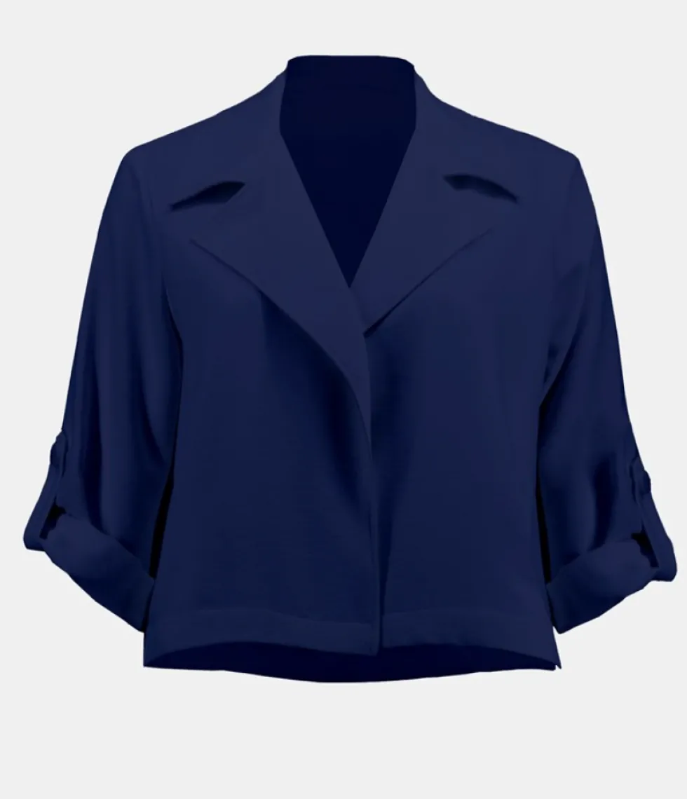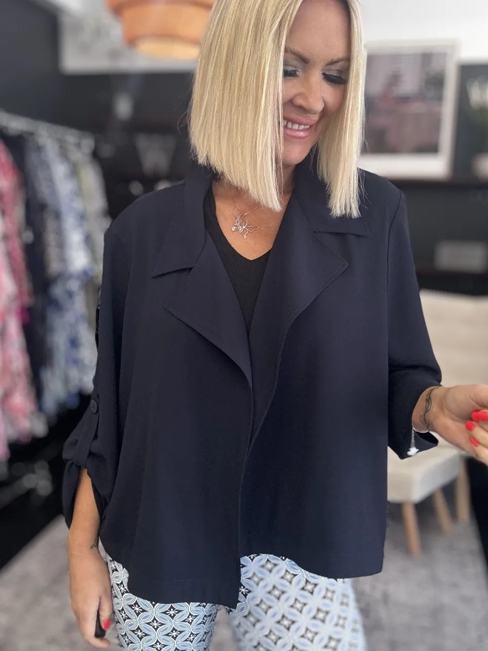 Casablanca Woven Boxy Cover Up -Midnight Blue 242059 by Joseph Ribkoff at The Wardrobe This is a sale item and is only eligible to return for a store credit or exchange. Also available in white Create a polished look for any occasion with this exquisite woven cover up. This garment is tailored in a short boxy silho