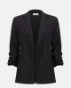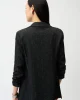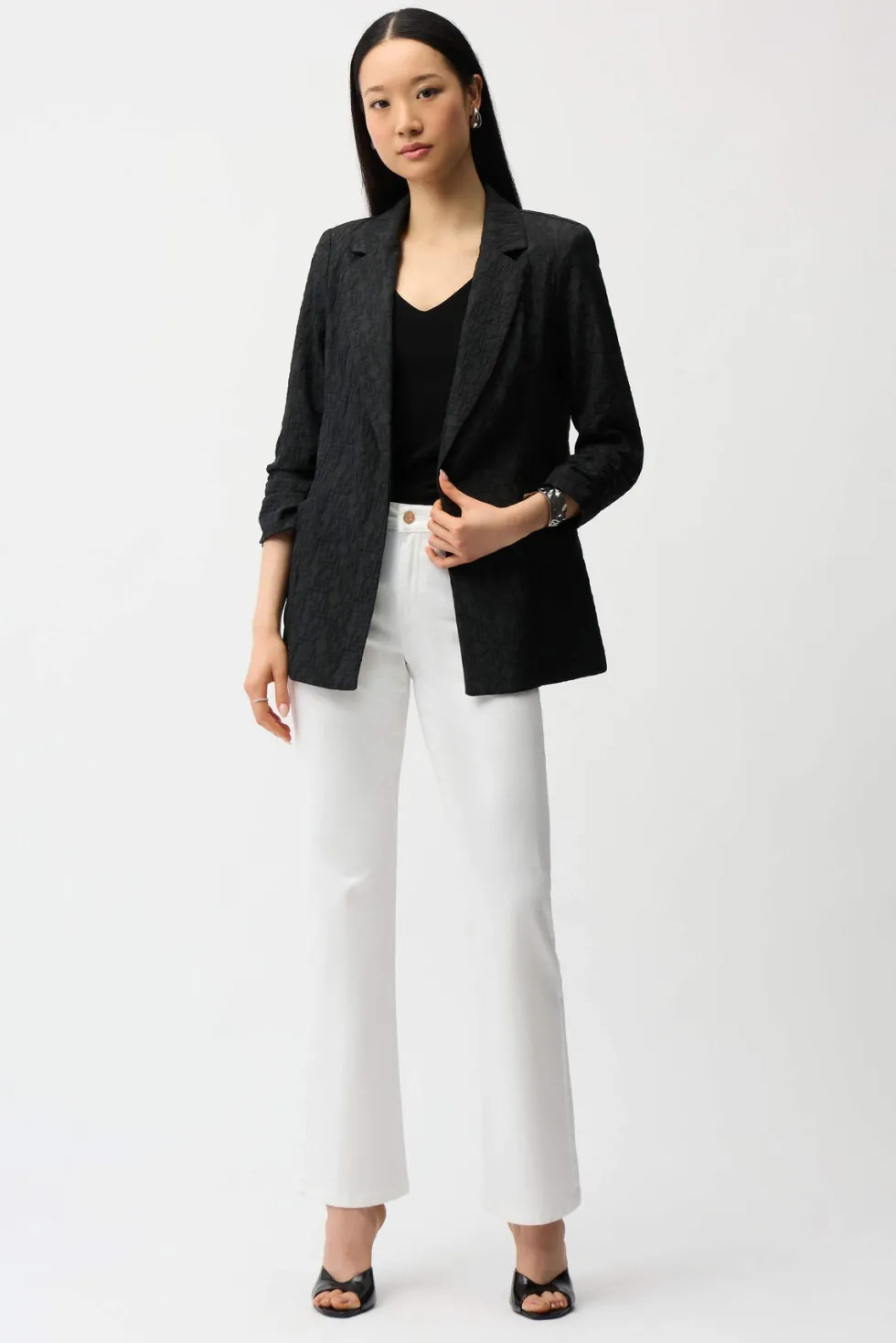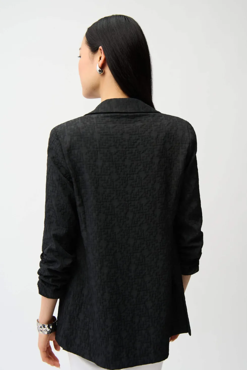 Santa Cruz Woven Jacquard Texture Boxy Blazer242034S26 – Black By Joseph Ribkoff at The Wardrobe. This is a carry over style. A boxy silhouette lends a bold appeal to a wardrobe favourite. Tailored from a stunning jacquard fabric, this solid blazer features a notched collar and shirred three-quarter sleeves, both coor