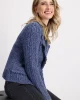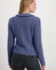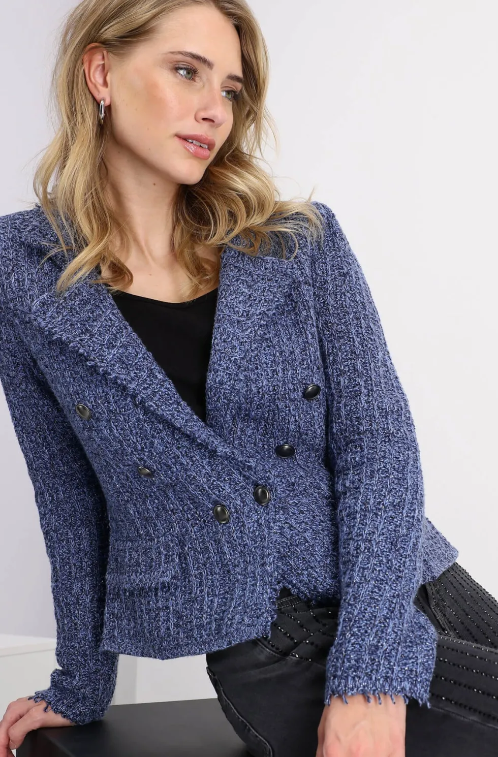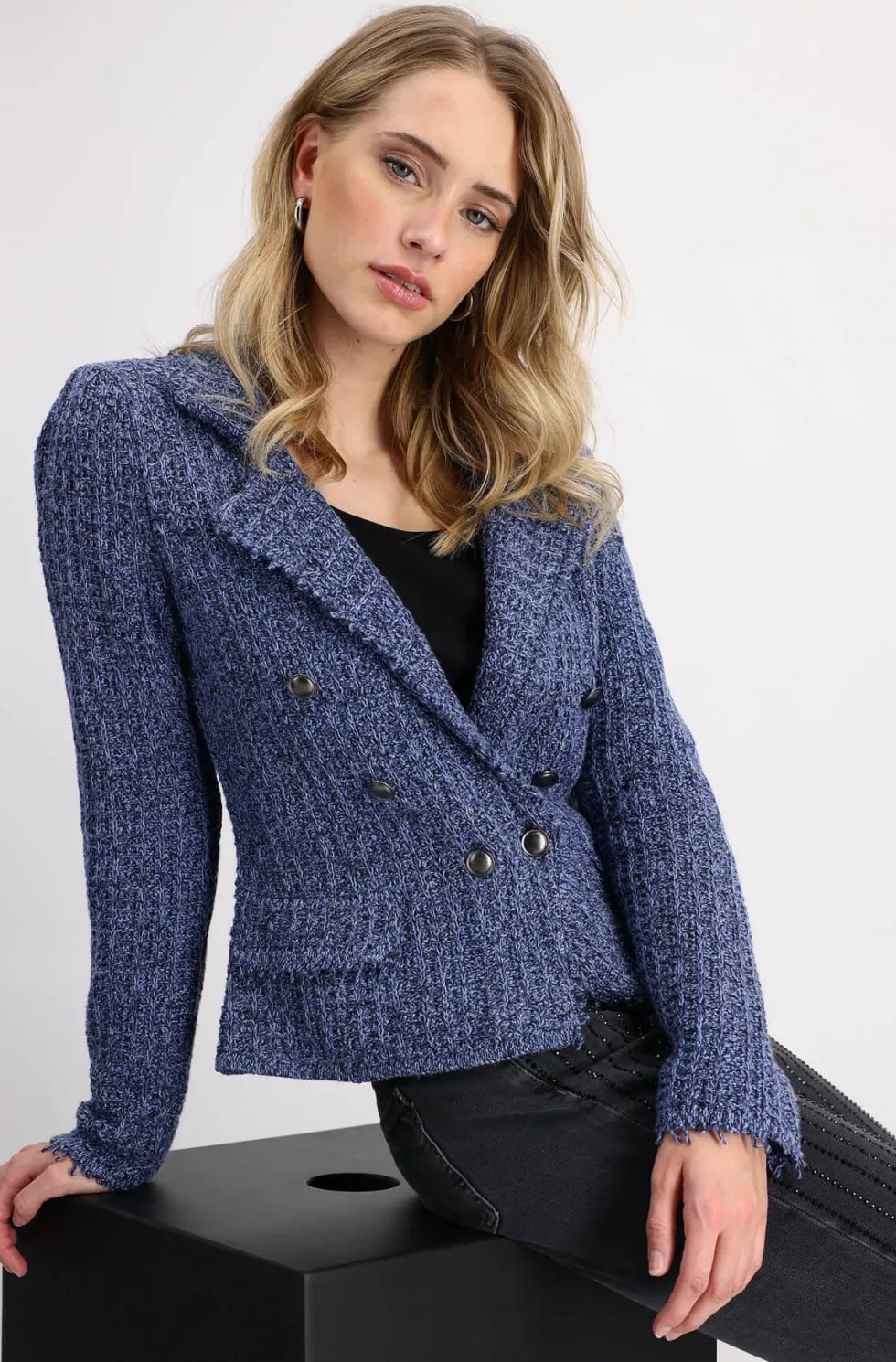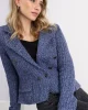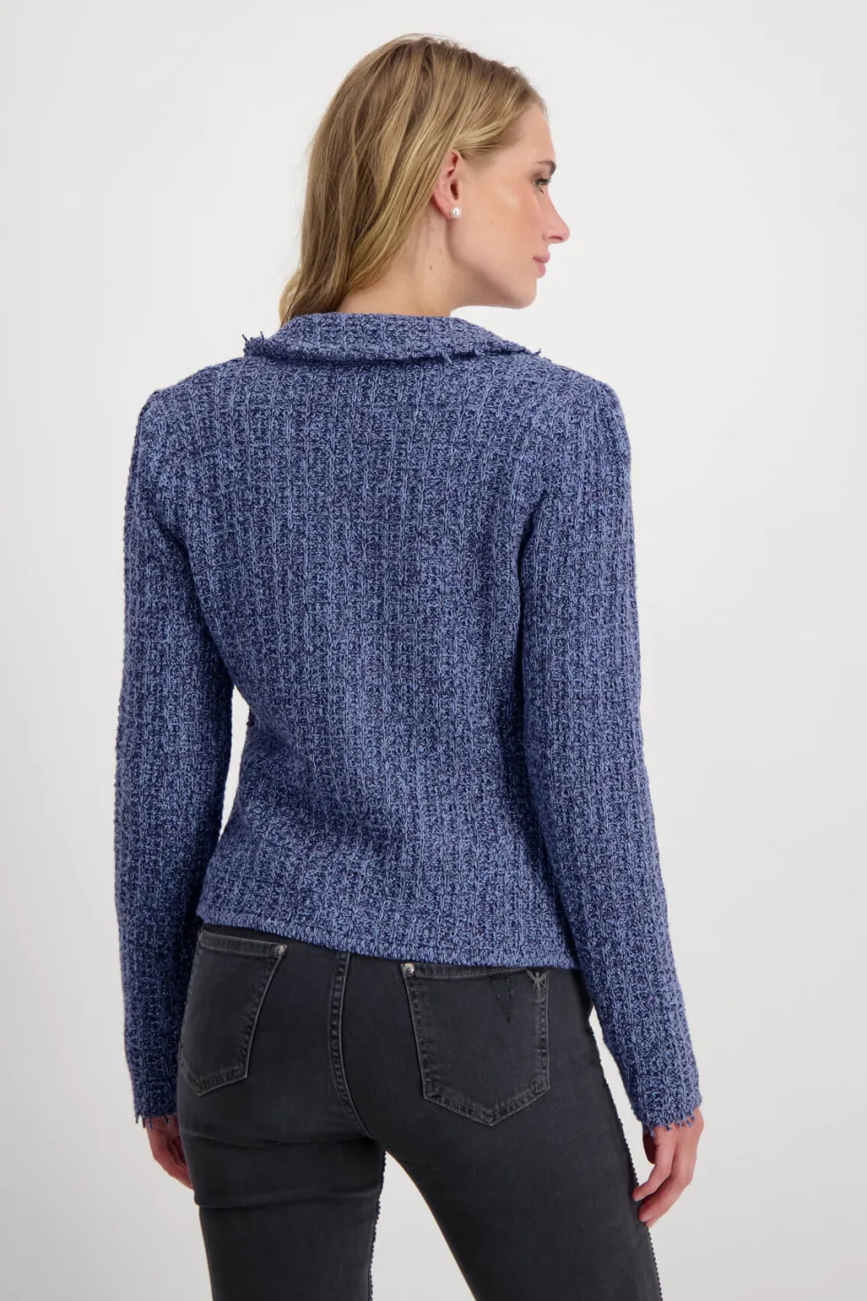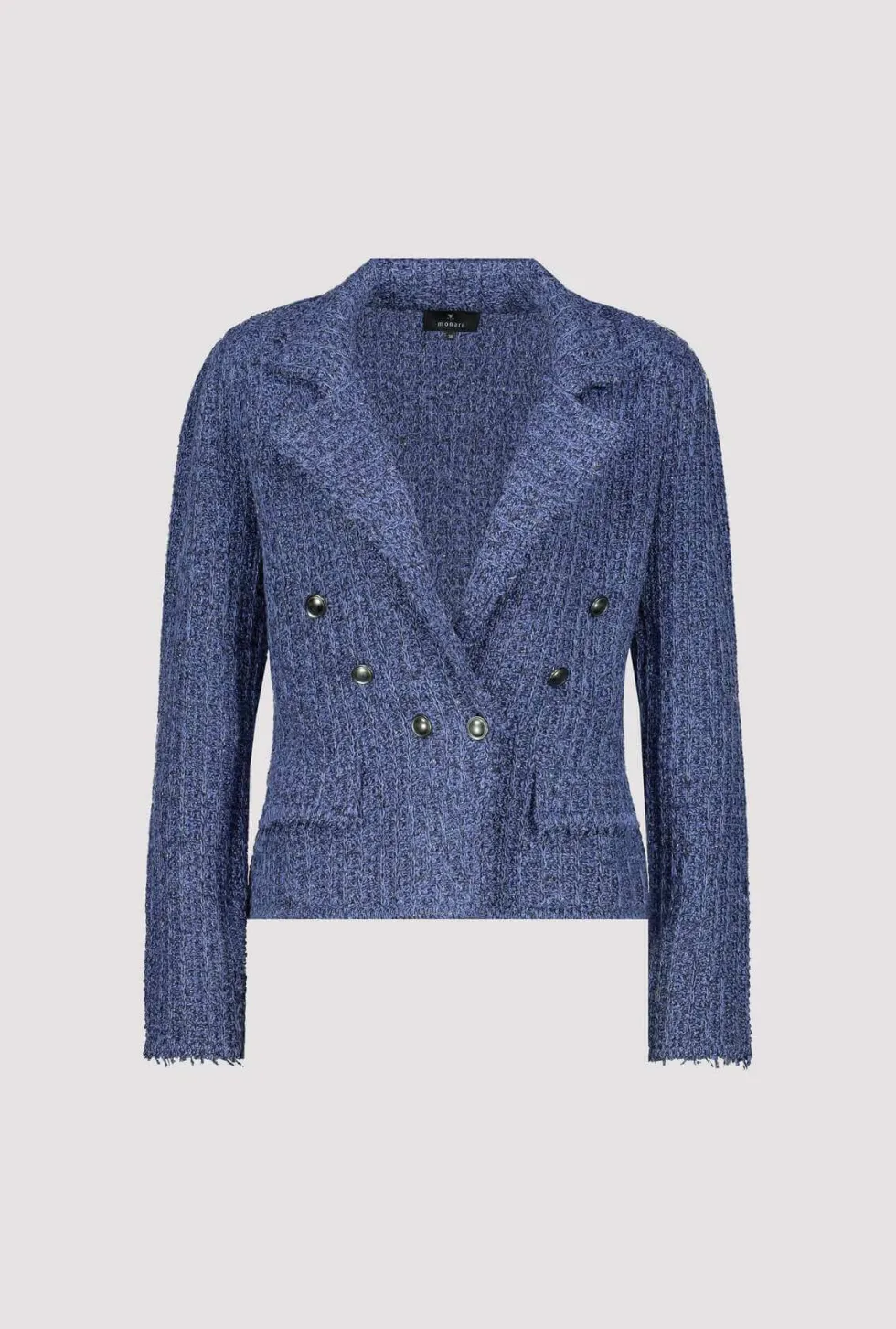 Lapel Collar Jacket – Indigo 408488 by Monari at The Wardrobe. 77% cotton; 14% polyester; 7% viscose; 2% metallized polyester Gentle machine wash/Wool detergent/Wash inside out This tweed blazer in high quality cotton and glittering yarn features decorative buttons, is slightly fitted and has cool frayed edges.