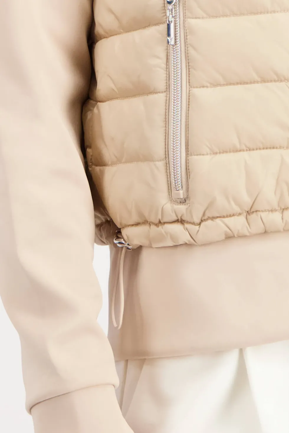 Quilted Neoprene Jacket -Biscuit 807294 by Monari at The Wardrobe 100% polyamide; 92% polyester; 8% elastane; 100% polyester This comfortable material mix jacket is both ultralight and warming. Its long sleeves, stand-up collar and attached hem are made of an elegant neoprene fabric, while its body has a quilted finish
