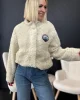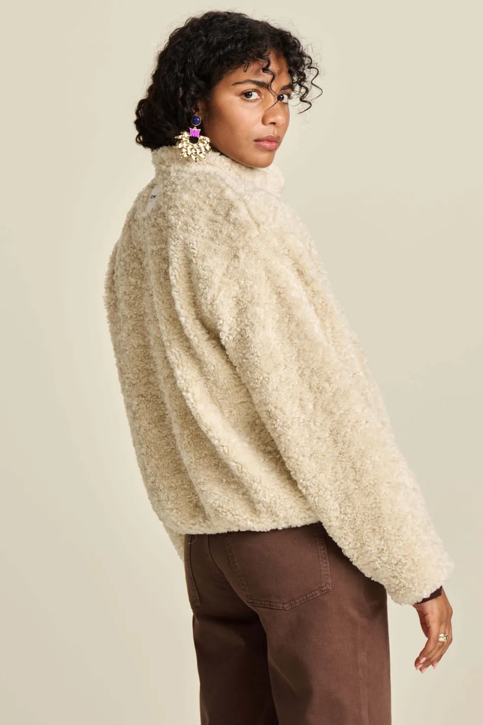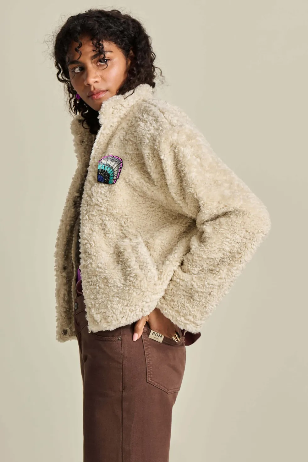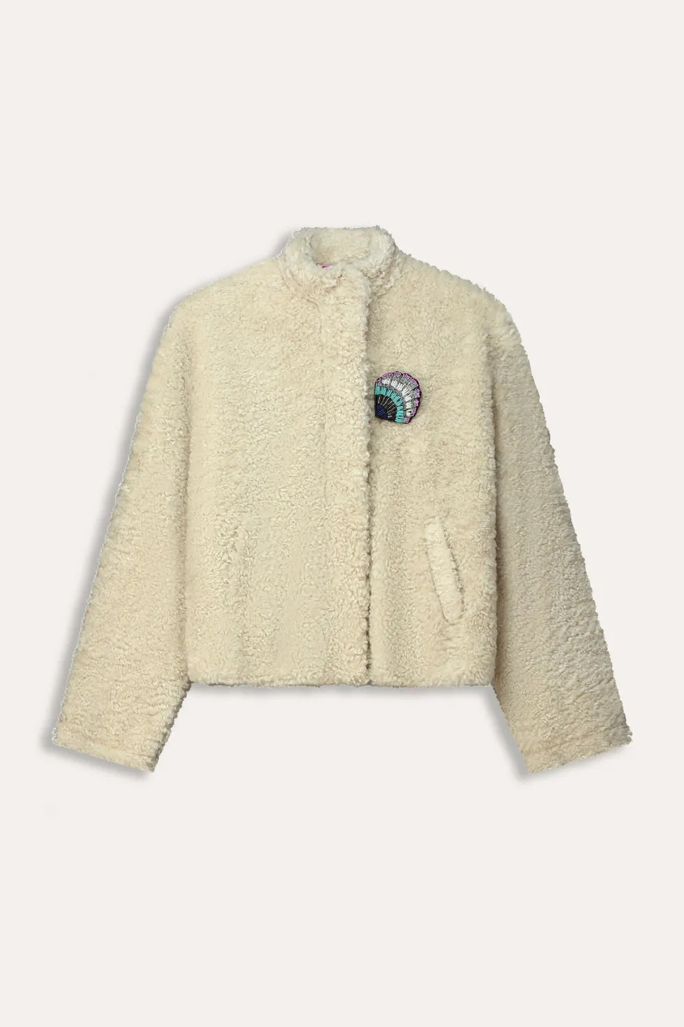 Teddy Ecru Jacket 8013 POM Amsterdam at The Wardrobe. 100% Polyester This ecru teddy jacket is perfect for autumn. The jacket is wonderfully soft and comfortable thanks to its teddy fabric. The jacket has a beautiful detachable brooch in the shape of a shell. • Off-white jacket
