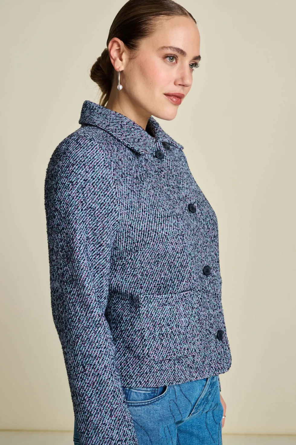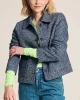 Tweed Blue Jacket Pom8015 by Pom Amsterdam at The Wardrobe Discover our blue tweed jacket, the perfect combination of sophistication and comfort. With its fine texture and luxurious look, this is the perfect jacket for autumn. • Blue jacket• Pink and black woven tweed fabric• Textured fabric• Short fi