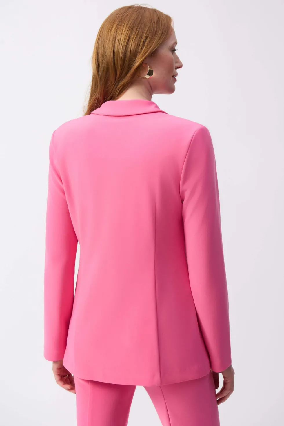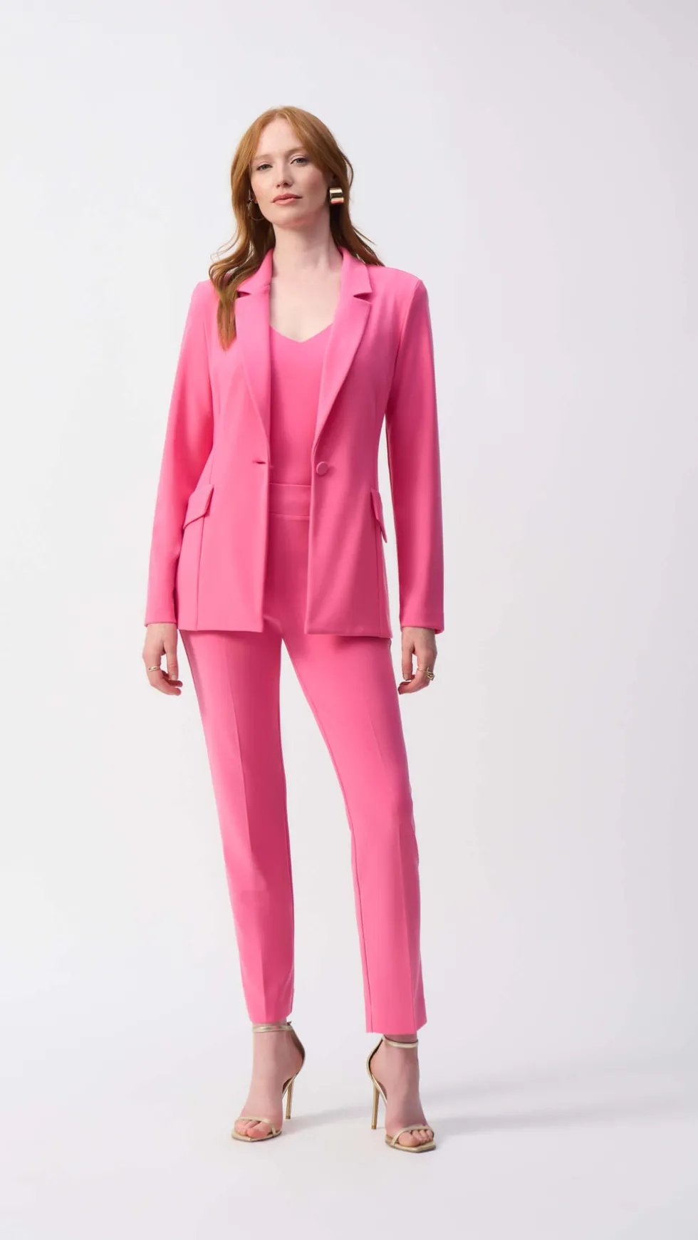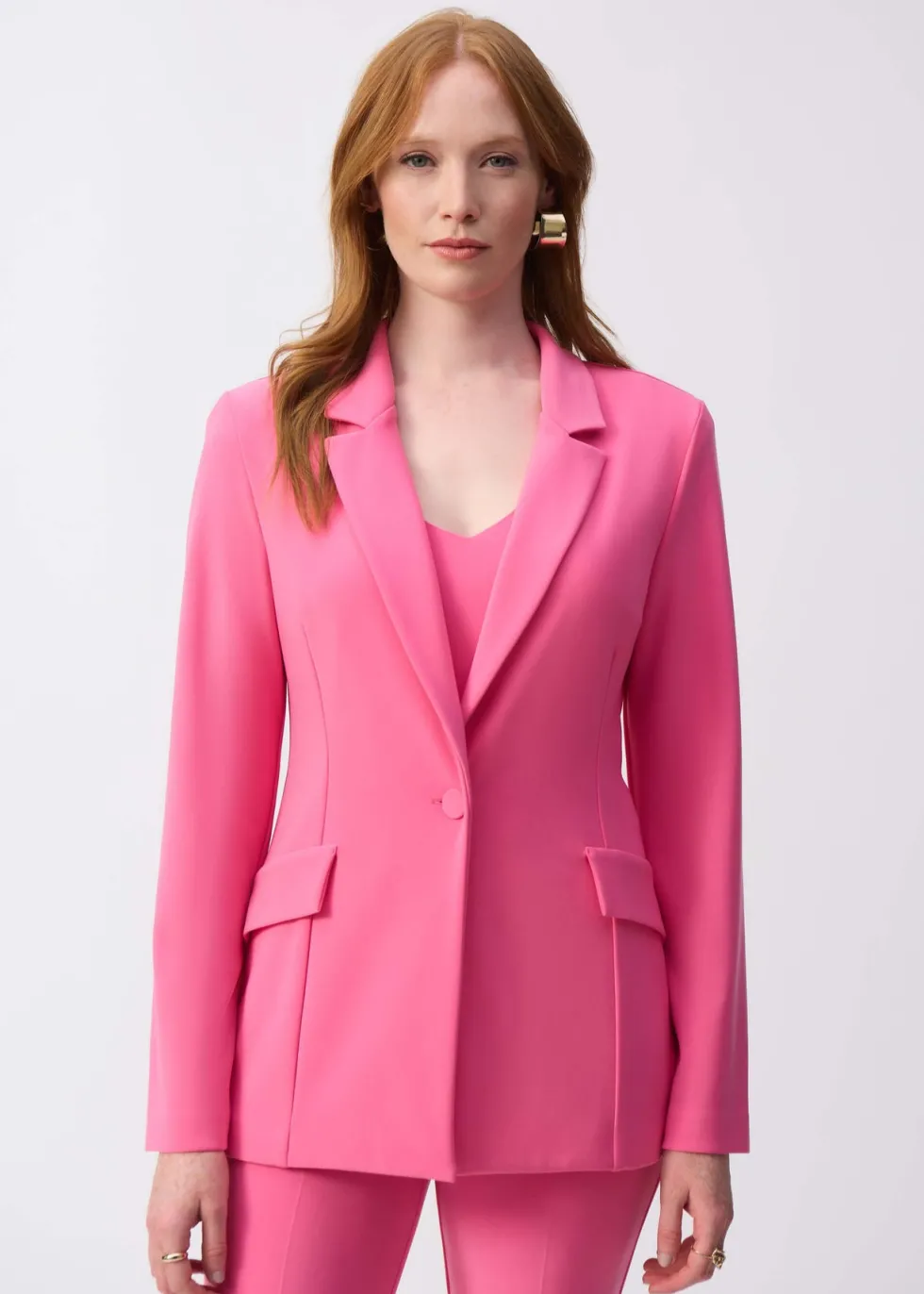 Palm Canyon Straight Blazer – Bubblegum Pink 251240 by Joseph Ribkoff at The Wardrobe. Expertly tailored with darting at the front and back, this classic silky knit blazer offers a professional look with a perfect straight fit. Details like a notched collar, matching front button, and faux-pocket flaps raise this piece