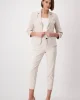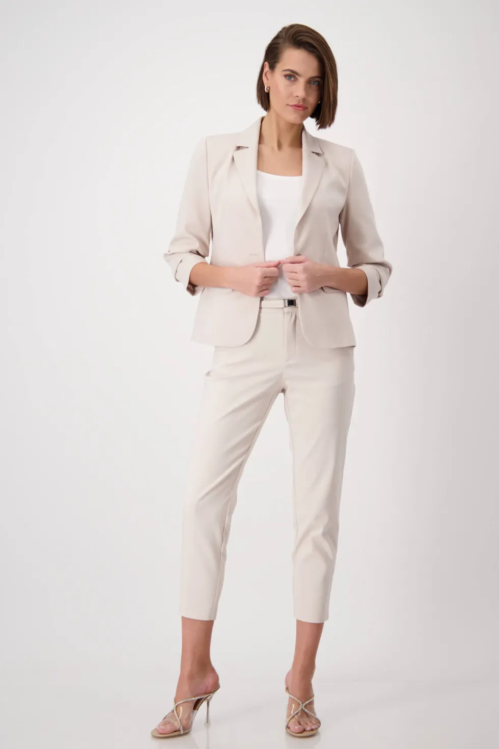 Pleated Sleeve Blazer – Warm Sand 409060 by Monari at The Wardrobe. High-quality cotton blend Stretchy material Crimped sleeves Lapel collar Regular fit ¾ sleeves Button placket Fake flap pockets Longer at the front The model is 1.79 m tall and wears size 36. The back length of size 38 is 62 cm and the front length is