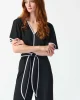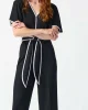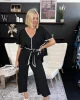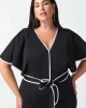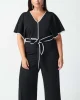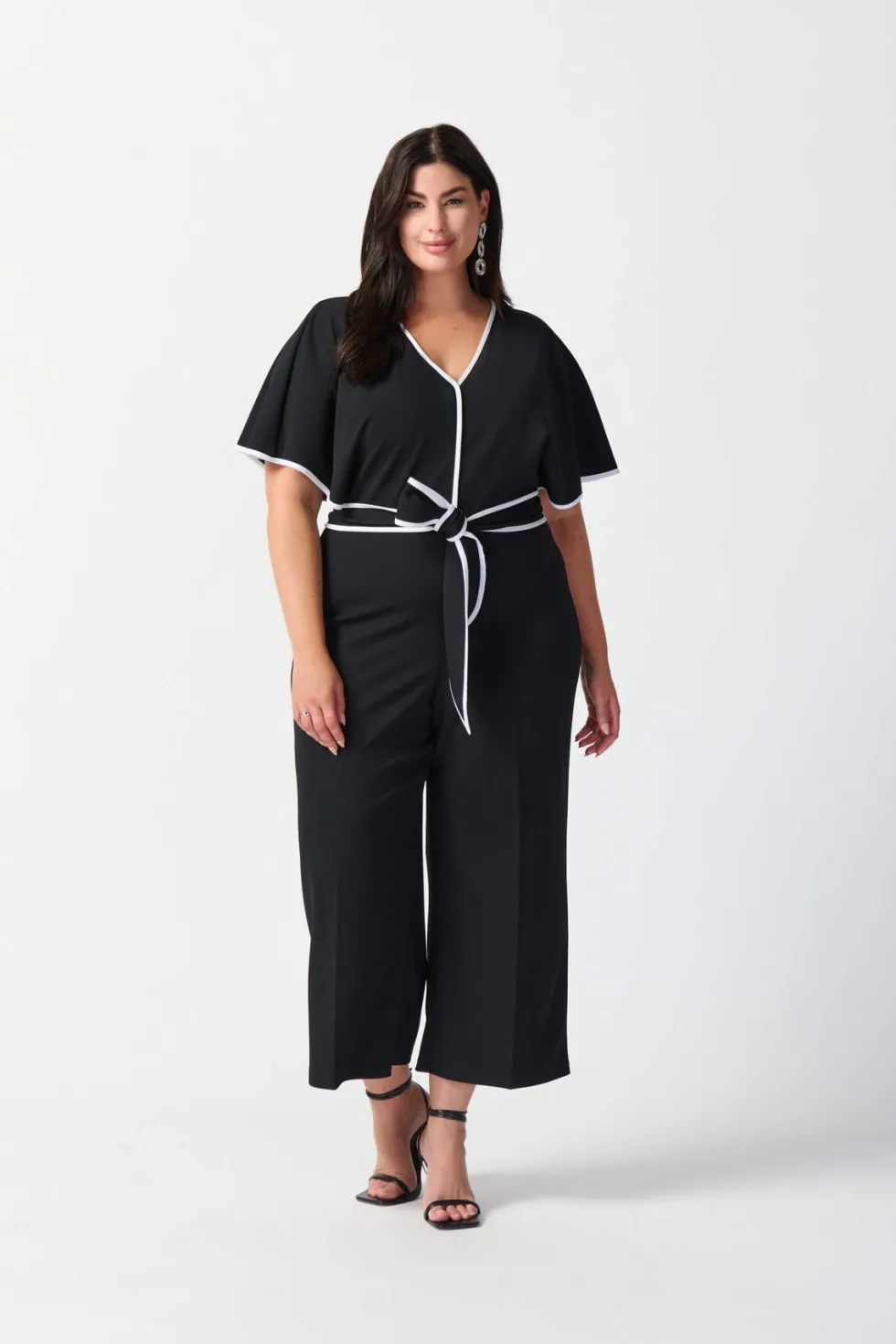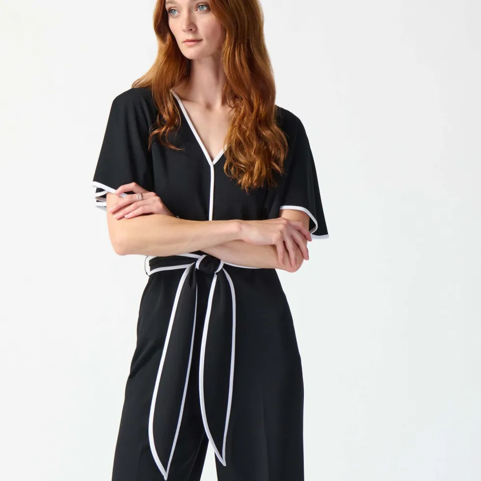 Casablanca Scuba Crepe Belted Jumpsuit – Black/Vanilla 242082 by Joseph Ribkoff at The Wardrobe This is a sale item and is only eligible to return for a store credit or exchange. 95% Polyester, 5% Spandex Scuba crepe and georgette V neck Short butterfly sleeves Belt Unlined Hand wash in cold water with like colors Do n