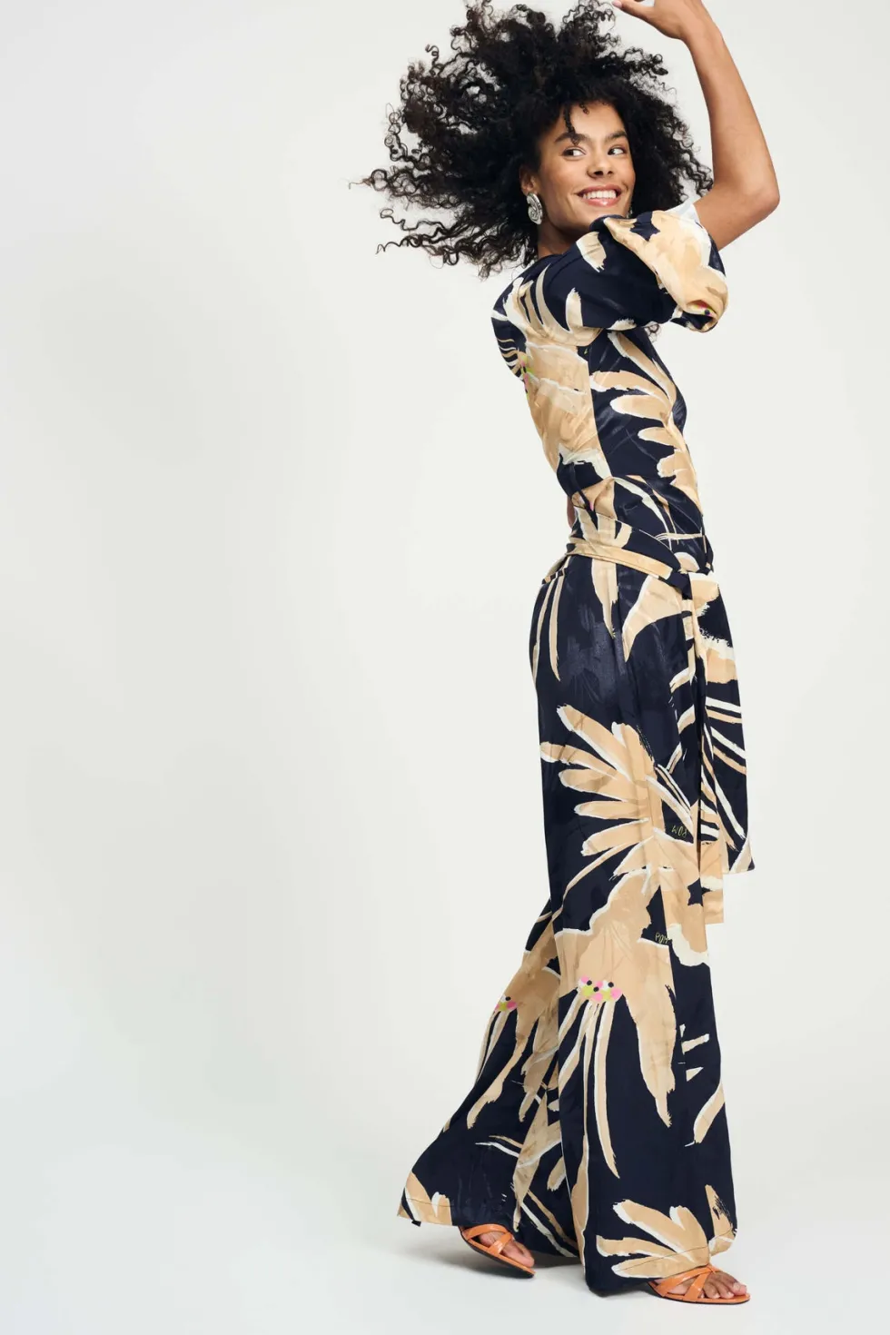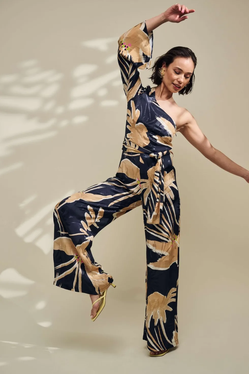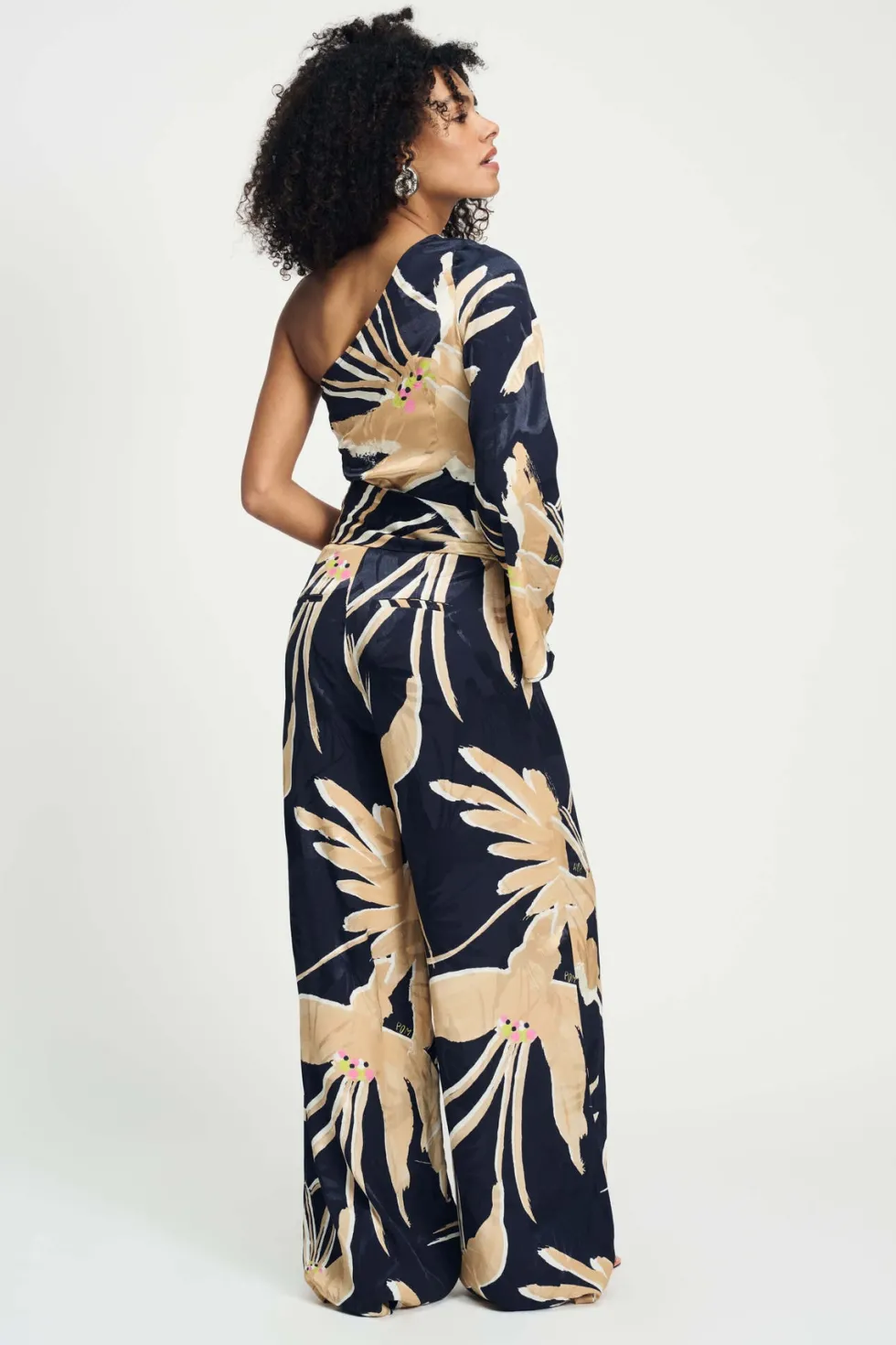 One Shoulder Artisan Jumpsuit – Sand 9181 by POM Amsterdam at The Wardrobe. This beautiful blue jumpsuit features a one shoulder design and a bow belt at the waist. The jumpsuit is made from 37% Lenzing™ Ecovero™ viscose, making it a 'more sustainable' choice. 65% Viscose 35% Lenzing Ecovero Viscose Cool machine wash a