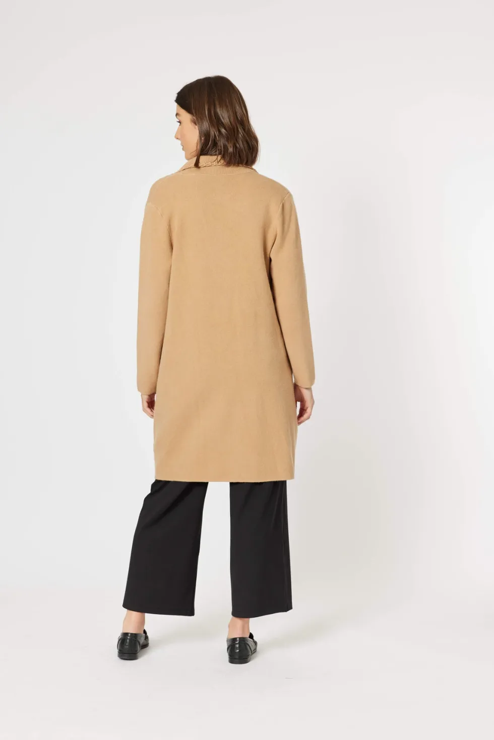 Cosy Cardigan – Caramel 46608 by Clarity at The Wardrobe. Experience the best of both worlds with this hybrid piece that combines the warmth of a coat and the comfort of a cardigan. With its unique stitch detailing and practical patch pocket, this stylish piece is sure to be a staple in your wardrobe. The single button