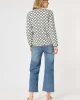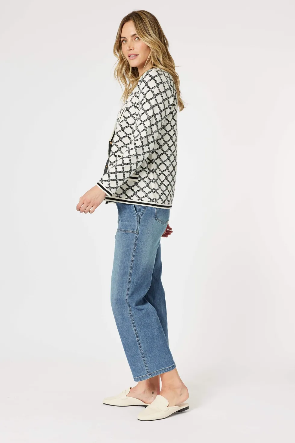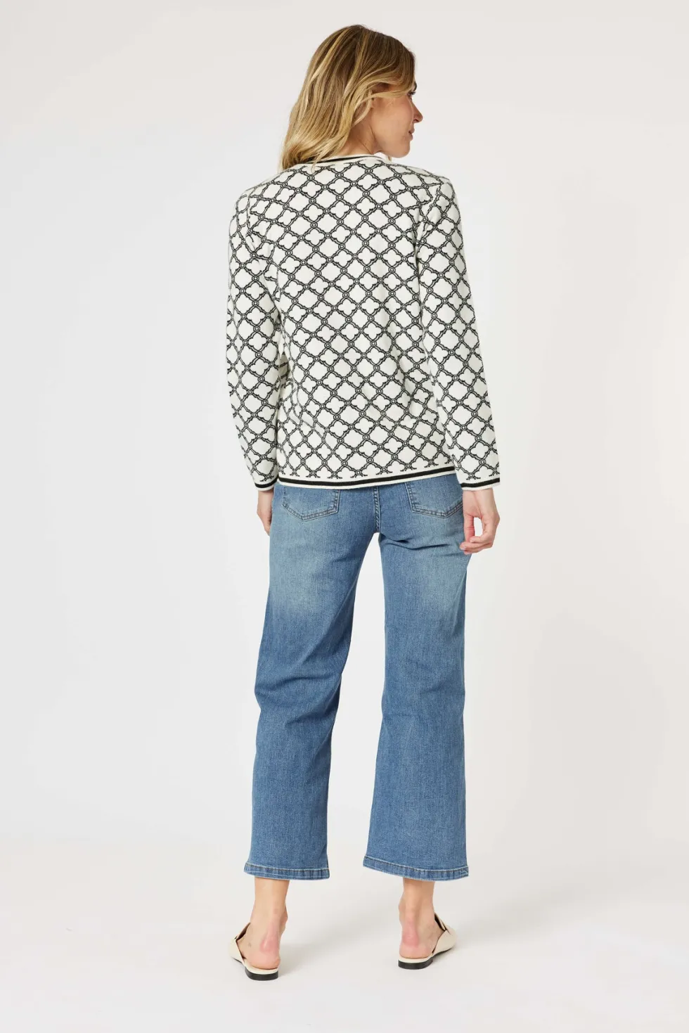 The Clover Print Knit Cardigan 46611 by Gordon Smith at The Wardrobe features a unique, stylish pattern. The Clover Top also available. Accented with gold buttons and faux pockets, adding a touch of sophistication to any outfit. The stripe detail on the hem and cuffs adds visual interest and complements the design beau